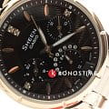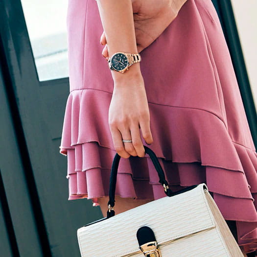 Тёмный циферблат с оригинальным узором идеально смотрится в сочетании с цветом розового золота, такой оттенок был получен благодаря нанесению IP-покрытияIP-покрытиеМетод ионного напыления. Демонстрирует повышенную устойчивость к истиранию, окислению и химическим веществам. Под воздействием высокого давления и температуры около 1500°C молекулы металла надёжно соединяются с частицами корпуса часов.. В качестве декорирующих элементов использованы оригинальные кристаллы Swarovski с роскошным сиянием. Корпус и браслет выполнены из долговечной хирургической стали 316L. Минеральное стекло. Индикация даты и дня недели. Люминесцентная подсветкаЛюминесцентное покрытиеПозволяет считывать показания времени в темноте. Производители наносят на стрелки, часовые индексы, безель или поверхность циферблата светонакопительный состав, дающий холодное свечение.. Водозащита до 50 метров. Габариты: 41,4 x 45,3 x 11,2 мм.