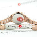 Белый циферблат с оригинальным узором и синими акцентами идеально смотрится в сочетании с цветом розового золота, такой оттенок был получен благодаря нанесению IP-покрытияIP-покрытиеМетод ионного напыления. Демонстрирует повышенную устойчивость к истиранию, окислению и химическим веществам. Под воздействием высокого давления и температуры около 1500°C молекулы металла надёжно соединяются с частицами корпуса часов.. В качестве декорирующих элементов использованы оригинальные кристаллы Swarovski с роскошным сиянием. Корпус и браслет выполнены из долговечной хирургической стали 316L. Минеральное стекло. Индикация даты и дня недели. Люминесцентная подсветкаЛюминесцентное покрытиеПозволяет считывать показания времени в темноте. Производители наносят на стрелки, часовые индексы, безель или поверхность циферблата светонакопительный состав, дающий холодное свечение.. Водозащита до 50 метров. Габариты: 41,4 x 45,3 x 11,2 мм.