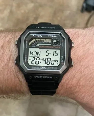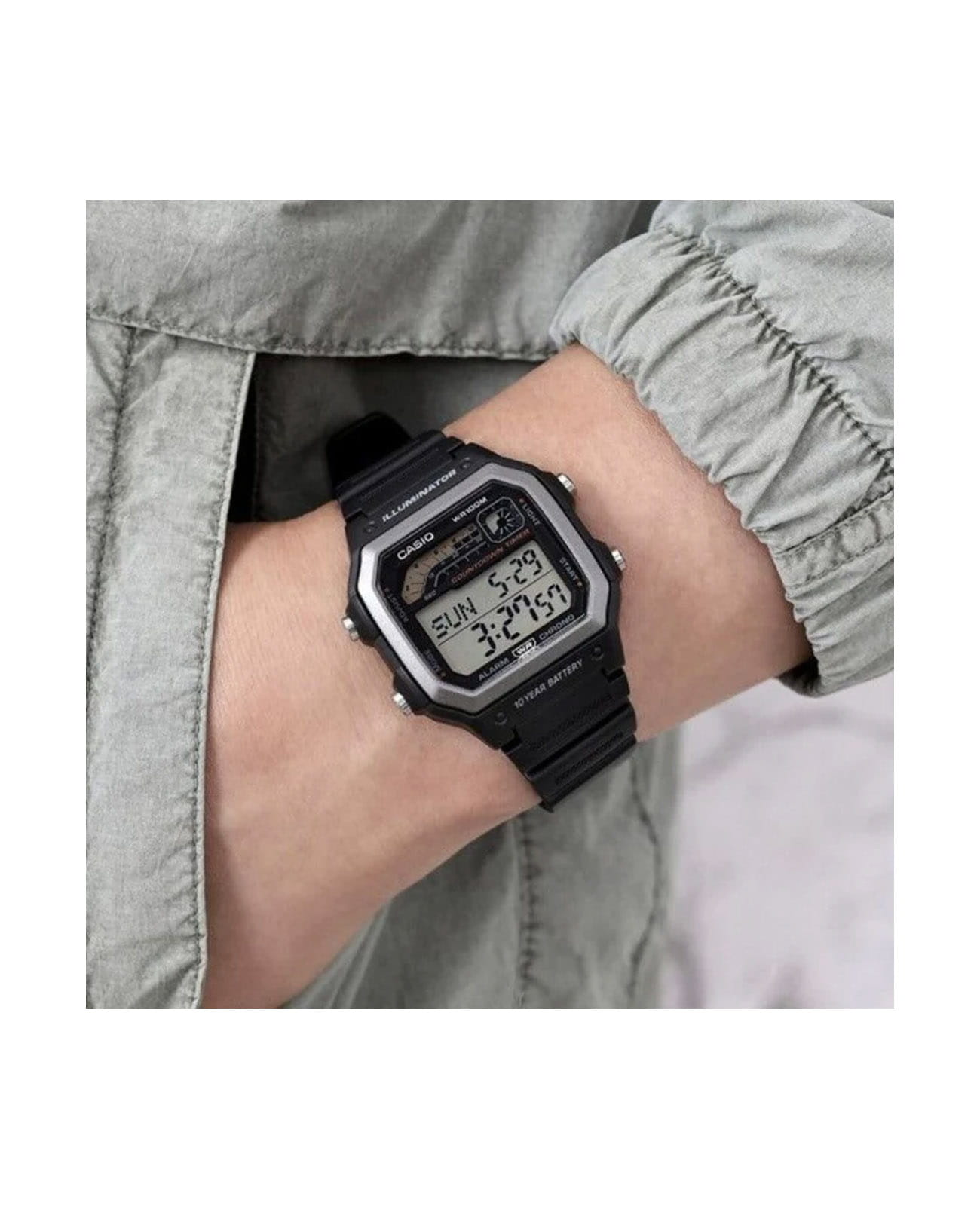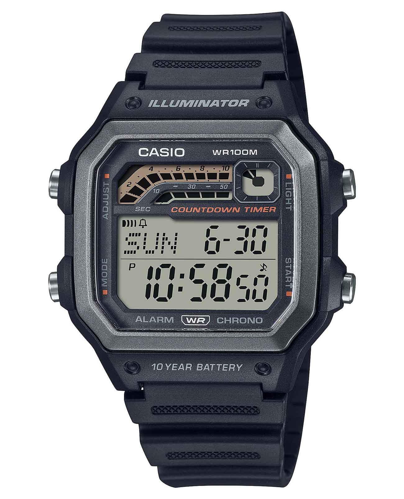 Японские мужские часы с секундомеромСекундомерСекундоме́р — прибор, способный измерять интервалы времени с точностью до долей секунды. Casio Collection WS-1600H-1A. Корпус изготовлен из пластика. Ежедневный будильникБудильникБуди́льник — часы, в заданный момент времени подающие звуковой, световой и/или в редких случаях другой сигнал.. Ежечасный сигнал. Автоматический календарь. ТаймерТаймерОтсчитывает секунды в обратном направлении в заданном интервале времени.. Функция мирового времениМировое время Полезное часовое усложнение, отображающее время в основных городах и известных областях по всему миру, оно связано с часовыми поясами, удобно для путешественников и бизнесменов. . Функция включения/выключения звука кнопок. Класс водозащиты: 100 метров, позволит плавать, нырять и заниматься другими водными видами спорта. Ремешок из полимерного материала на стандартной застежке.