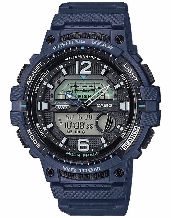 Аксессуар представлен в спортивном стиле. Синий полимерный ремешок имеет протекторную поверхность, боковые кнопки рифленые. В верхней части циферблата расположился индикатор рыбалки. Устройство поможет чётко рассчитать благоприятное время для рыбной ловли, в этот момент на экране появятся символы в виде рыбок. Корпус выполнен из полимерного пластика, материал устойчив к ударам, повреждениям. Японский кварцевый механизм. Батарейка рассчитана на 3 года работы. Акриловое стекло не повреждается при падении. Циферблат с оранжевой светодиодной подсветкойСветодиодная подсветкаСветодиодная или LED-подсветка обеспечивает появление яркого холодного свечения за счёт LED-элементов - маленьких лампочек. Они потребляют минимальное количество энергии, чаще всего можно встретить 1 светодиод, в нижней части циферблата.. Класс водостойкости WR 100. Отображение мирового времениМировое время Полезное часовое усложнение, отображающее время в основных городах и известных областях по всему миру, оно связано с часовыми поясами, удобно для путешественников и бизнесменов. . Будильник с функцией повтора, отображение лунных фаз, хронографХронографФункция позволяет измерять отрезки времени с особой точностью: часы, минуты, секунды. Верным признаком хронографа является наличие на циферблате 3 дополнительных окошек-счётчиков., таймер, вечный календарьВечный календарьКлассическое часовое усложнение, представляющее собой календарь, рассчитанный на несколько лет вперёд (стандартно – до 2099 года). Определяет текущую дату, день недели, месяц.. Габариты: 47,9 x 48,6 x 14 мм.
