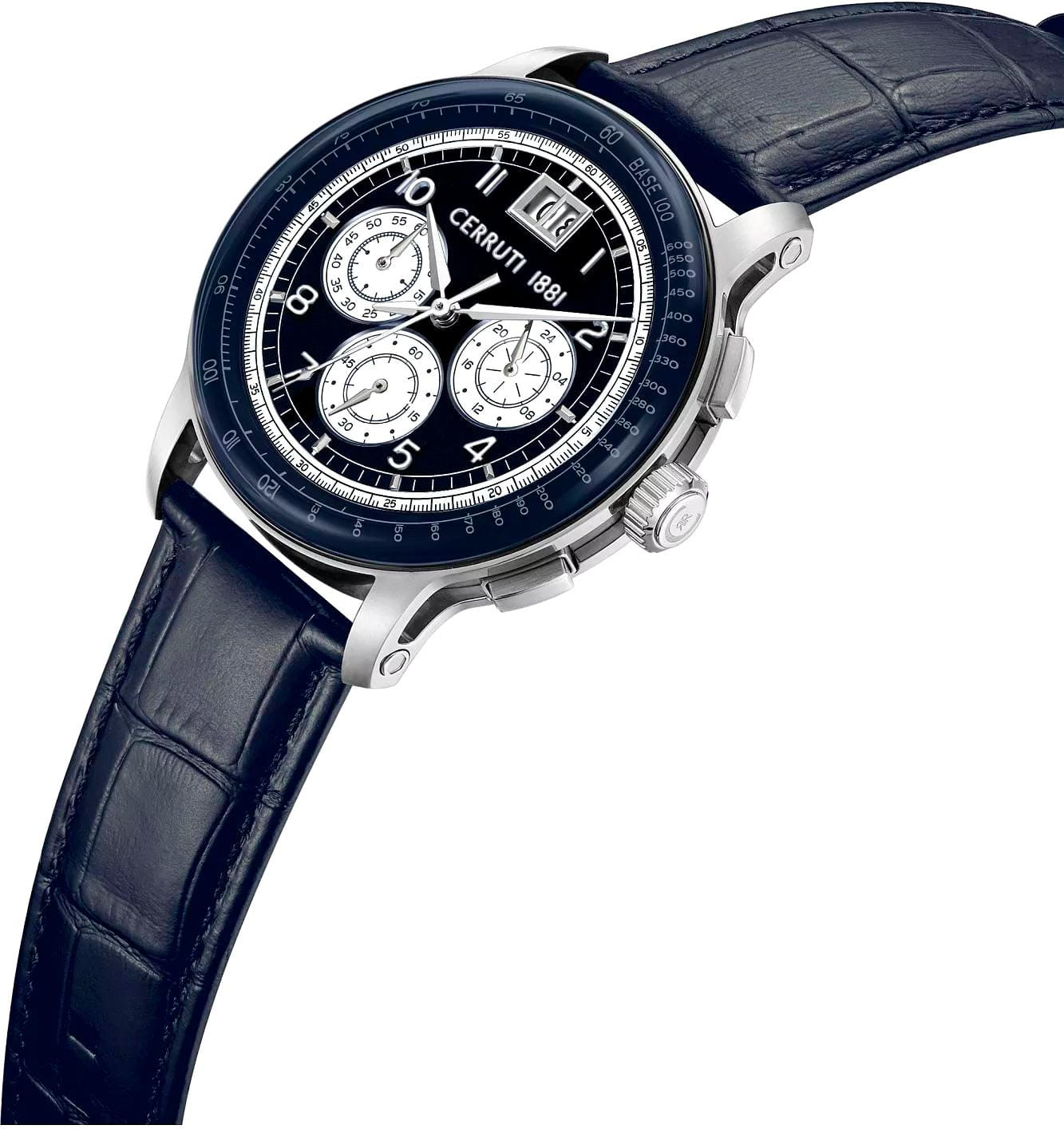Cerruti 1881 CIWGC0084603 — выразительные мужские часы, выполненные в гармоничном сочетании стали, синего ремня и насыщенного синего циферблата. Модель оснащена функциональным хронографомХронографФункция позволяет измерять отрезки времени с особой точностью: часы, минуты, секунды. Верным признаком хронографа является наличие на циферблате 3 дополнительных окошек-счётчиков. с тремя счётчиками и крупным окном даты на «12 часах», что подчёркивает её практичность и динамичный характер. Корпус из нержавеющей стали защищён прочным минеральным стекломМинеральное стеклоМинеральное стекло представляет собой искусственно выращенный минерал кварца. Такое стекло отличается особой устойчивостью к повреждениям и царапинам. Уступает по некоторым качествам сапфировому стеклу., устойчивым к мелким повреждениям. Циферблат дополнен тахиметрической шкалой по безелюБезельВнешний ободок, закрепляющий стекло. В спортивных часах так называется поворотное кольцо с делениями на циферблате, выполняет роль таймера – замеряет отрезки времени на шкале. Неподвижный безель – элемент декора. Однонаправленно вращающийся безель на дайверских часах позволяет фиксировать моменты погружения и выныривания на поверхность. с PVD-покрытиемPVDУльтратонкое покрытие наносится в технике вакуумного напыления, сочетает в себе нитрид титана особой прочности со слоем золота или оксида хрома. Несёт в себе декоративную или защитную функцию., позволяющей измерять скорость движения. Элегантный ремень из натуральной кожи с аккуратной прострочкой застёгивается надёжной стандартной застежкой, обеспечивая комфорт и долговечность. Модель объединяет классическую утончённость и спортивный дух, оставаясь универсальным аксессуаром для современного мужчины.