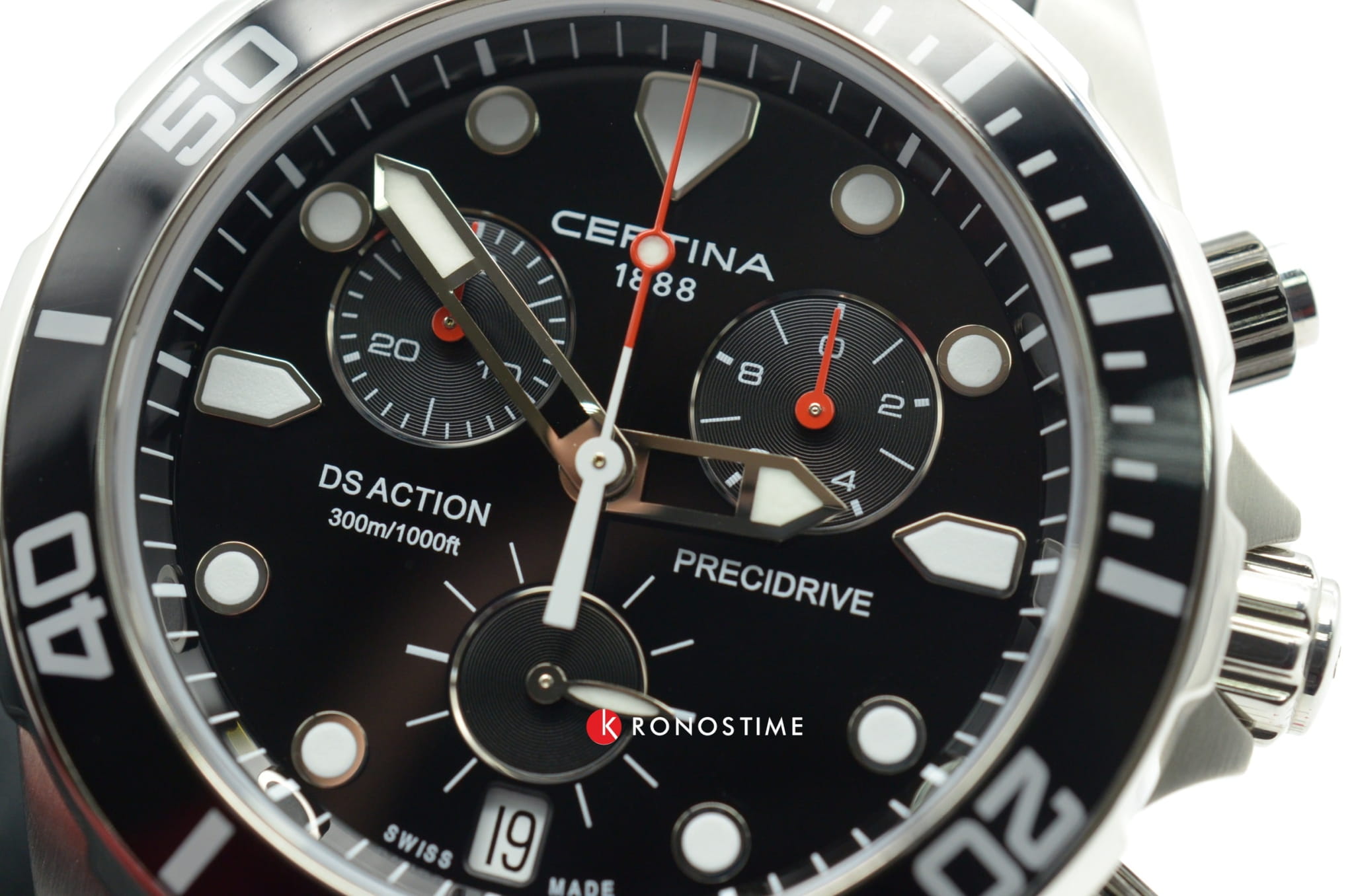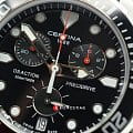 Наручные часы отличаются привлекательным дизайном, чёрный циферблат имеет крупную индикацию времени, расставлены акценты красного цвета. Модель комплектуется кварцевым механизмом ETA Precidrive™Precidrive™Инновационный кварцевый механизм Certina. Часы, оснащённые этим швейцарским калибром, приравниваются к точности к сертифицированным хронометрам, точность хода составляет +/-10 секунд в год., отличающимся отменной точностью хода. Вращающийся безельБезельВнешний ободок, закрепляющий стекло. В спортивных часах так называется поворотное кольцо с делениями на циферблате, выполняет роль таймера – замеряет отрезки времени на шкале. Неподвижный безель – элемент декора. Однонаправленно вращающийся безель на дайверских часах позволяет фиксировать моменты погружения и выныривания на поверхность. имеет чёрное PVD-покрытиеPVDУльтратонкое покрытие наносится в технике вакуумного напыления, сочетает в себе нитрид титана особой прочности со слоем золота или оксида хрома. Несёт в себе декоративную или защитную функцию., защищающее от царапин. Сапфировое стекло с антибликовой обработкой. Силиконовый ремешок. Индикатор EOLEOLПредставляет собой систему, уведомляющую владельца часов о необходимости замены элемента питания. За 2 недели до полного разряда батарейки секундная стрелка перестаёт ходить чётко и начинает перепрыгивать на 3-4 деления.. Секундомер, хронографХронографФункция позволяет измерять отрезки времени с особой точностью: часы, минуты, секунды. Верным признаком хронографа является наличие на циферблате 3 дополнительных окошек-счётчиков., окошко даты. Диаметр корпуса: 43 мм.