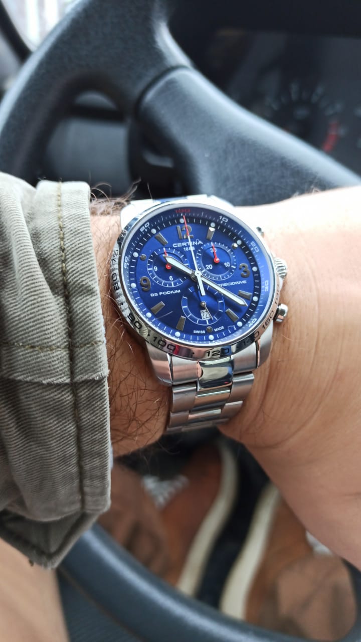 Наручные часы станут превосходным дополнением для образа, такой аксессуар выбирают успешные и уверенные в себе мужчины. Модель в сине-серебристой расцветке с красными элементами оформления выполнена из хирургической стали 316L. Для материала характерны антикоррозионные свойства и устойчивость к царапинам и повреждениям. Абсолютная точность хода обеспечивается благодаря швейцарскому кварцевому калибру ETA 251.264 Precidrive™Precidrive™Инновационный кварцевый механизм Certina. Часы, оснащённые этим швейцарским калибром, приравниваются к точности к сертифицированным хронометрам, точность хода составляет +/-10 секунд в год.. Ударопрочность и водонепроницаемость 200 метров - реализация технологии DS ConceptDS ConceptDouble Security Concept, обозначает двойную надёжность и безупречную точность часов Certina. Двойная система защиты подразумевает обеспечение максимальной устойчивости к ударам и высоких показателей водонепроницаемости.. Закручивающиеся заводная головка и задняя крышка. Стекло из сапфира с двухсторонним антибликовым покрытием. БезельБезельВнешний ободок, закрепляющий стекло. В спортивных часах так называется поворотное кольцо с делениями на циферблате, выполняет роль таймера – замеряет отрезки времени на шкале. Неподвижный безель – элемент декора. Однонаправленно вращающийся безель на дайверских часах позволяет фиксировать моменты погружения и выныривания на поверхность. со шкалой тахиметраТахиметрРазмеченная шкала, располагается на ободке или безеле часов. Тахиметр позволяет рассчитать скорость на определённом участке пути, расстояние измеряется в километрах или милях.. Измерение времени 1/100 секунды, дата. Индикатор EOLEOLПредставляет собой систему, уведомляющую владельца часов о необходимости замены элемента питания. За 2 недели до полного разряда батарейки секундная стрелка перестаёт ходить чётко и начинает перепрыгивать на 3-4 деления.. Диаметр корпуса: 44 мм.