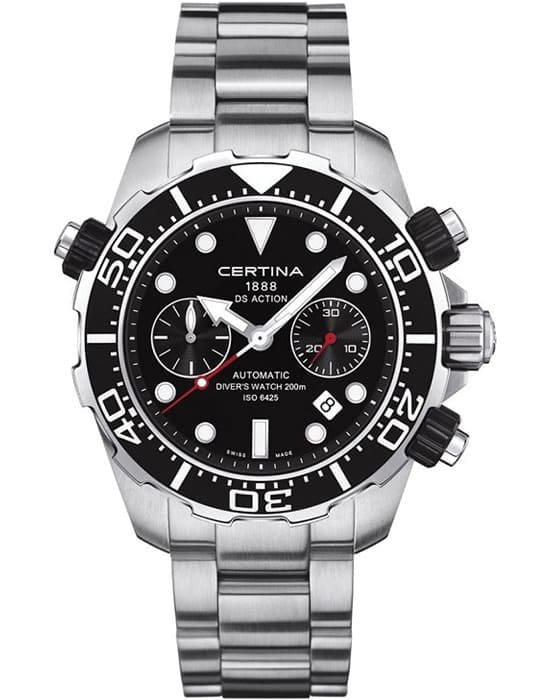 Спортивный аксессуар с классическими деталями дизайна тёмный циферблат с крупной индикацией времени, удобства добавляет секундная стрелка с красным наконечником. Модель комплектуется премиальным калибром ETA 7753 ValjouxValjouxПремиальный калибр от швейцарской компании ETA c уникальной отделкой механизма. Отличается увеличенным запасом хода от 45 до 60 часов, в зависимости от калибра, точность хода составляет +/- 5 секунд в сутки. с запасом хода 54 часов. Сапфировое стекло с антибликовой обработкой. Вращающийся безельБезельВнешний ободок, закрепляющий стекло. В спортивных часах так называется поворотное кольцо с делениями на циферблате, выполняет роль таймера – замеряет отрезки времени на шкале. Неподвижный безель – элемент декора. Однонаправленно вращающийся безель на дайверских часах позволяет фиксировать моменты погружения и выныривания на поверхность.. Система DS Concept DS ConceptDouble Security Concept, обозначает двойную надёжность и безупречную точность часов Certina. Двойная система защиты подразумевает обеспечение максимальной устойчивости к ударам и высоких показателей водонепроницаемости.. Водостойкость при давлении 20 бар. ХронографХронографФункция позволяет измерять отрезки времени с особой точностью: часы, минуты, секунды. Верным признаком хронографа является наличие на циферблате 3 дополнительных окошек-счётчиков., секундомер, апертура даты. Люминесцентная подсветкаЛюминесцентное покрытиеПозволяет считывать показания времени в темноте. Производители наносят на стрелки, часовые индексы, безель или поверхность циферблата светонакопительный состав, дающий холодное свечение.. Диаметр корпуса: 45 мм.