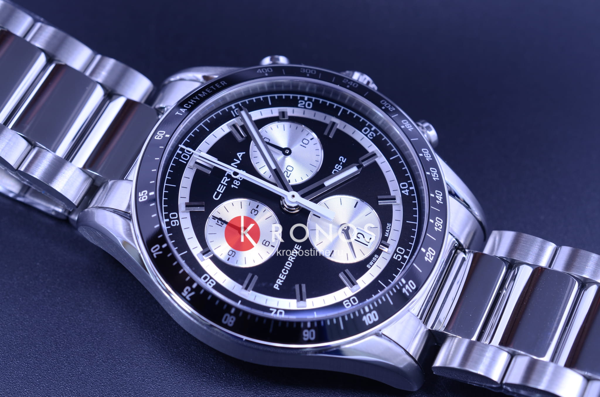 Брендовый аксессуар сразу притягивает внимание. Циферблат «panda-style», дополненный контрастными элементами и функциональными окошками, отражает спортивную динамичность. Алюминиевый безельБезельВнешний ободок, закрепляющий стекло. В спортивных часах так называется поворотное кольцо с делениями на циферблате, выполняет роль таймера – замеряет отрезки времени на шкале. Неподвижный безель – элемент декора. Однонаправленно вращающийся безель на дайверских часах позволяет фиксировать моменты погружения и выныривания на поверхность. размечен шкалой тахиметраТахиметрРазмеченная шкала, располагается на ободке или безеле часов. Тахиметр позволяет рассчитать скорость на определённом участке пути, расстояние измеряется в километрах или милях.. Часы основаны на концепции Double SecurityDS ConceptDouble Security Concept, обозначает двойную надёжность и безупречную точность часов Certina. Двойная система защиты подразумевает обеспечение максимальной устойчивости к ударам и высоких показателей водонепроницаемости., что свидетельствует о высокой устойчивости к ударам и водонепроницаемости (до 10 бар) модели. Швейцарский кварцевый калибр ETA 251.264 Precidrive™Precidrive™Инновационный кварцевый механизм Certina. Часы, оснащённые этим швейцарским калибром, приравниваются к точности к сертифицированным хронометрам, точность хода составляет +/-10 секунд в год., измеряющий время с точностью до одной сотой секунды. Двухстороннее антибликовое покрытие для стекла из сапфира. Корпус и браслет из стали 316L с антикоррозионными свойствами. Задняя крышка с фирменной гравировкой. ХронографХронографФункция позволяет измерять отрезки времени с особой точностью: часы, минуты, секунды. Верным признаком хронографа является наличие на циферблате 3 дополнительных окошек-счётчиков., календарь, индикатор EOLEOLПредставляет собой систему, уведомляющую владельца часов о необходимости замены элемента питания. За 2 недели до полного разряда батарейки секундная стрелка перестаёт ходить чётко и начинает перепрыгивать на 3-4 деления., секундомер. Диаметр корпуса: 41 мм.