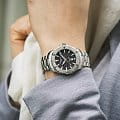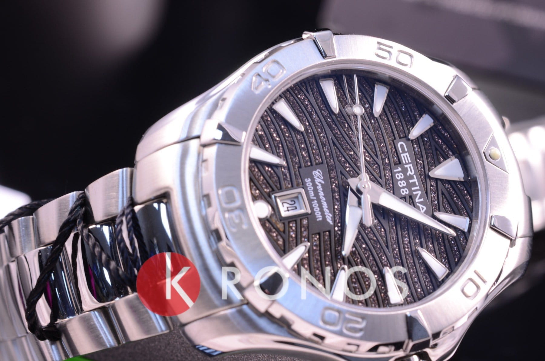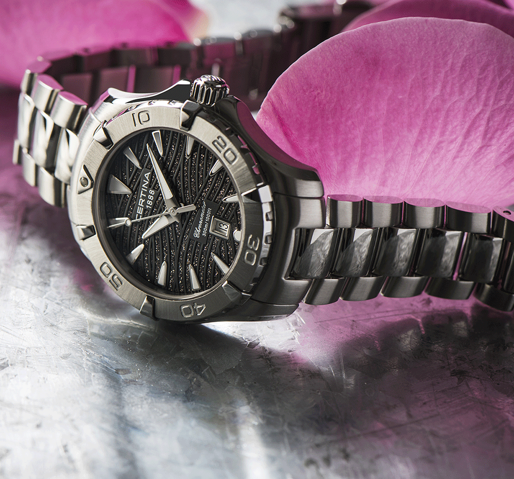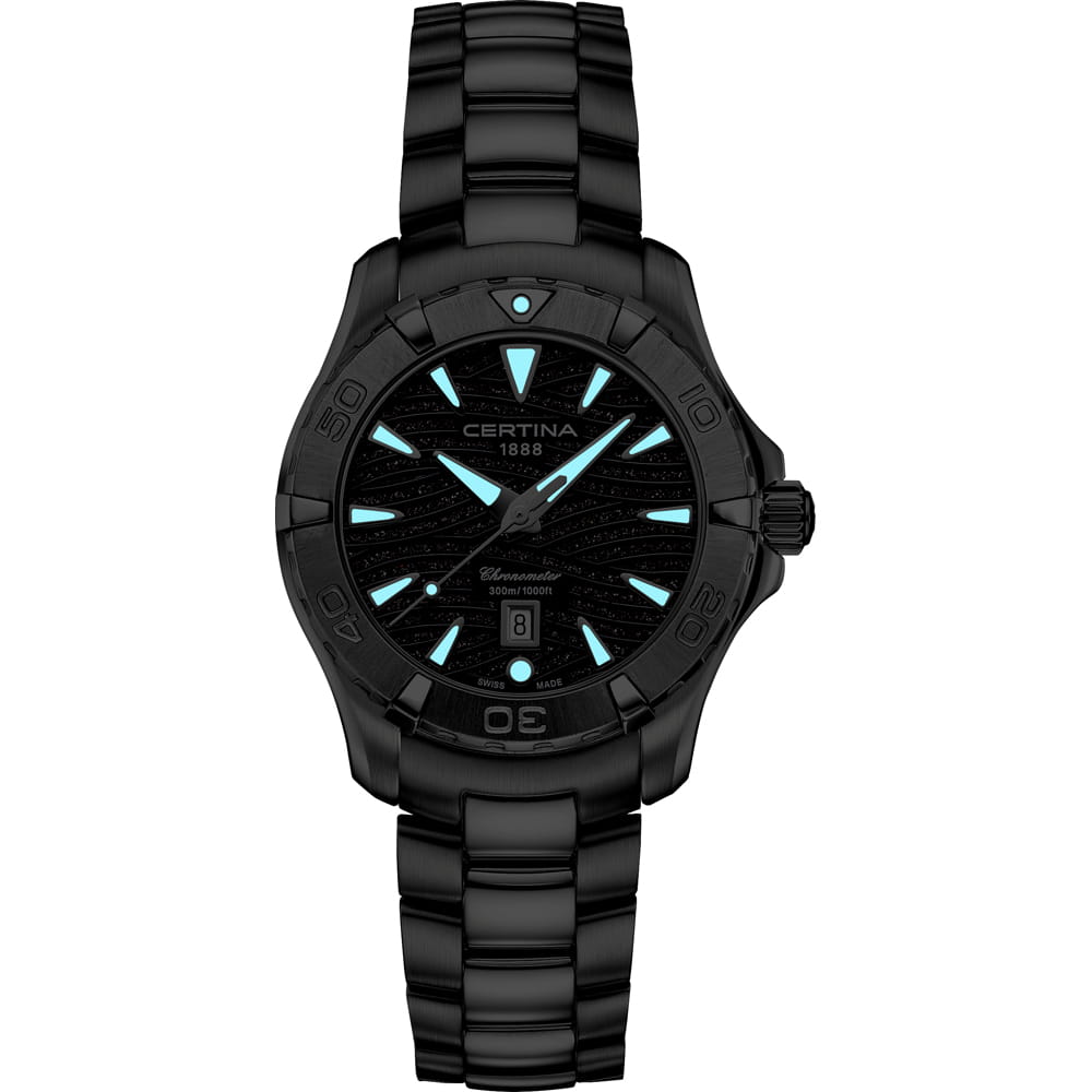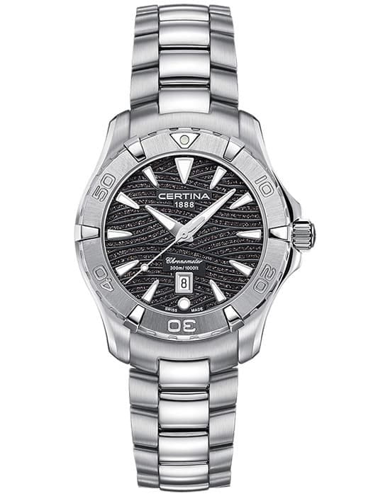 Компактный циферблат дополнен необычным узором в виде волн с блестящими акцентами, что стало выражением любви бренда Certina к морской стихии. Изящный аксессуар внутри просто «кремень», чему способствует система DS ConceptDS ConceptDouble Security Concept, обозначает двойную надёжность и безупречную точность часов Certina. Двойная система защиты подразумевает обеспечение максимальной устойчивости к ударам и высоких показателей водонепроницаемости.: водонепроницаемость 300 метров, завинчивающаяся задняя крышка и заводная головка с системой блокировки, сапфировое стекло, хирургическая сталь 316L. Швейцарский кварцевый механизм ETA F04.411 Precidrive™Precidrive™Инновационный кварцевый механизм Certina. Часы, оснащённые этим швейцарским калибром, приравниваются к точности к сертифицированным хронометрам, точность хода составляет +/-10 секунд в год. отмечен сертификатом хронометра COSCСертификат COSCОфициальный сертификат, подтверждающий то, что часы ходят с особо высокой точностью. Для получения документа часы подвергаются тестовым испытаниям, разработанным швейцарским институтом тестирования хронометров COSC. Допустимая норма для механических часов -4/+6 секунд в день, для кварцевых моделей +/- 0,07 секунд в день. за безупречную точность хода. Вращающийся безельБезельВнешний ободок, закрепляющий стекло. В спортивных часах так называется поворотное кольцо с делениями на циферблате, выполняет роль таймера – замеряет отрезки времени на шкале. Неподвижный безель – элемент декора. Однонаправленно вращающийся безель на дайверских часах позволяет фиксировать моменты погружения и выныривания на поверхность.. Яркая люминесцентная подсветкаЛюминесцентное покрытиеПозволяет считывать показания времени в темноте. Производители наносят на стрелки, часовые индексы, безель или поверхность циферблата светонакопительный состав, дающий холодное свечение.. Апертура даты, функция EOLEOLПредставляет собой систему, уведомляющую владельца часов о необходимости замены элемента питания. За 2 недели до полного разряда батарейки секундная стрелка перестаёт ходить чётко и начинает перепрыгивать на 3-4 деления.. Диаметр корпуса: 34 мм.
