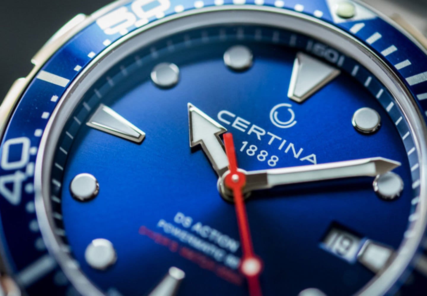 Серебристый аксессуар с синим циферблатом подходит для создания яркого акцента для делового образа. Красная секундная стрелка и крупные метки обеспечивают превосходную читаемость показаний времени. Автоподзавод. Швейцарский калибр ETA Powermatic 80Powermatic 80Эксклюзивный калибр от швейцарской компании ETA с увеличенным запасом хода до 80 часов за счёт удлинённой заводной пружины. Характеризуется улучшенной системой спуска со сниженным трением. с 80-часовым запасом хода. Реализация системы DS ConceptDS ConceptDouble Security Concept, обозначает двойную надёжность и безупречную точность часов Certina. Двойная система защиты подразумевает обеспечение максимальной устойчивости к ударам и высоких показателей водонепроницаемости.. Сапфировое стекло. Вращающийся безельБезельВнешний ободок, закрепляющий стекло. В спортивных часах так называется поворотное кольцо с делениями на циферблате, выполняет роль таймера – замеряет отрезки времени на шкале. Неподвижный безель – элемент декора. Однонаправленно вращающийся безель на дайверских часах позволяет фиксировать моменты погружения и выныривания на поверхность. из лёгкого алюминия. Водонепроницаемость 300 метров. Люминесцентная подсветкаЛюминесцентное покрытиеПозволяет считывать показания времени в темноте. Производители наносят на стрелки, часовые индексы, безель или поверхность циферблата светонакопительный состав, дающий холодное свечение.. Корпус и браслет из нержавеющей стали 316L. Застёжка с фиксатором и удлинением для дайверовУдлинение для дайверовЗастёжка с удлинением для дайверов представляет собой безопасное крепление, которое позволяет надевать часы поверх гидрокостюма. Гибкая застёжка удлиняется на 1-2 миллиметра.. Апертура даты. Диаметр корпуса: 43 мм.