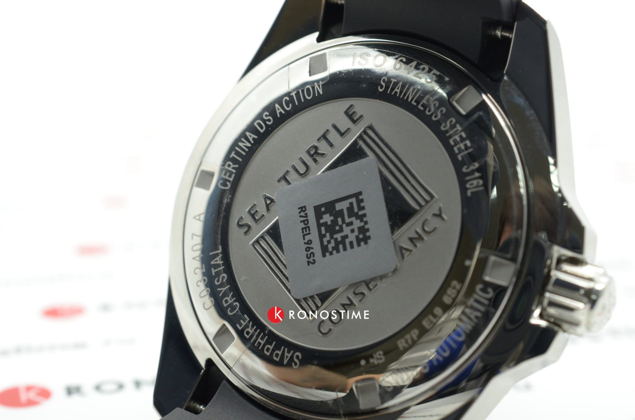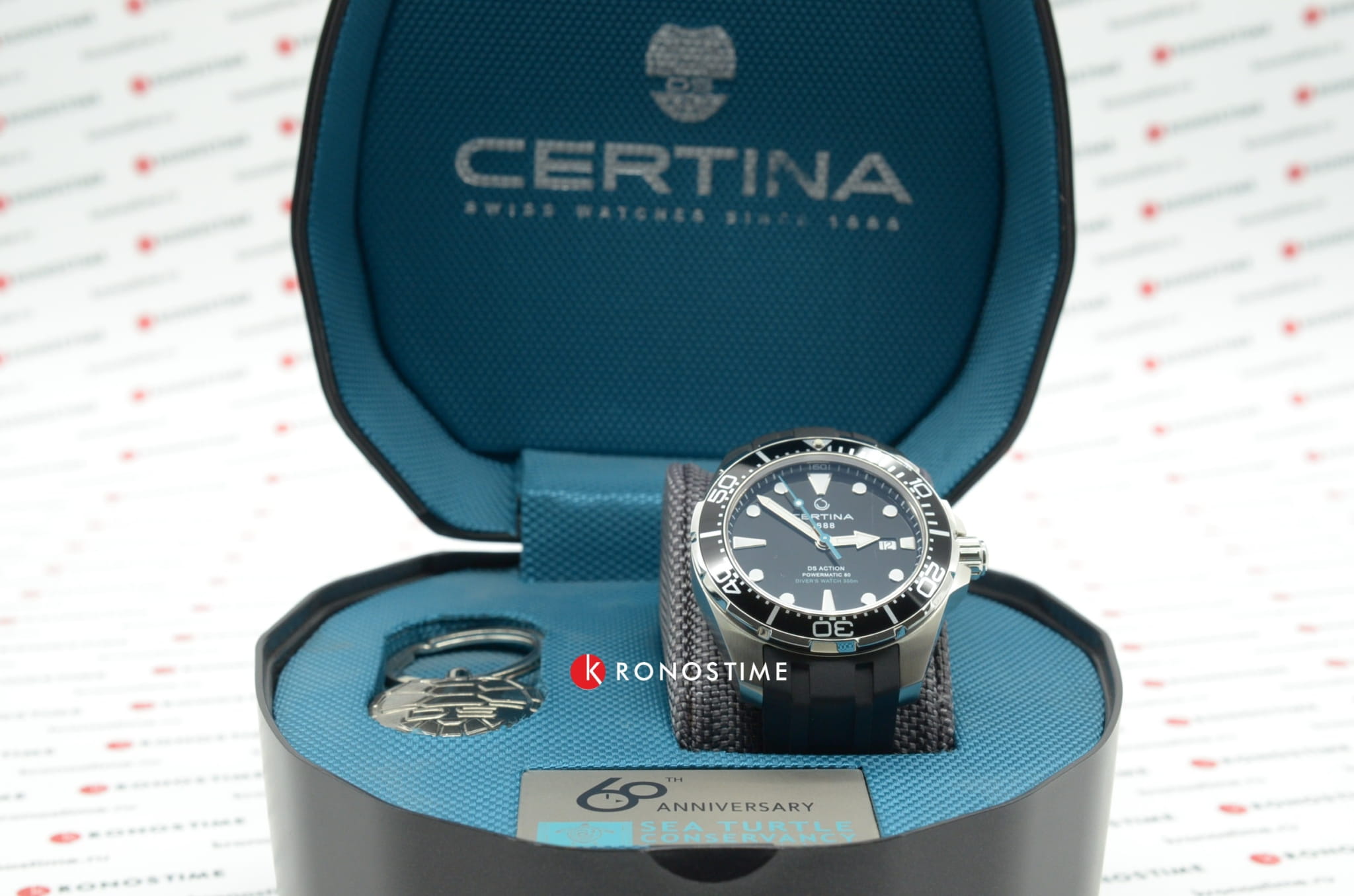 Аксессуар Special Edition посвящён крепкому сотрудничеству бренда и организации по спасению черепах Sea Turtle Conservancy. Об этом свидетельствует гравировка на задней крышке и оригинальная коробка в виде панциря черепахи. Модель в сдержанной расцветке имеет яркий акцент в виде голубой секундной стрелки. Крупная индикация времени позволяет считывать показания с циферблата в любой ситуации. Автоматический швейцарский калибр ETA Powermatic 80Powermatic 80Эксклюзивный калибр от швейцарской компании ETA с увеличенным запасом хода до 80 часов за счёт удлинённой заводной пружины. Характеризуется улучшенной системой спуска со сниженным трением. с резервом хода на 80 часов. Концепция DS ConceptDS ConceptDouble Security Concept, обозначает двойную надёжность и безупречную точность часов Certina. Двойная система защиты подразумевает обеспечение максимальной устойчивости к ударам и высоких показателей водонепроницаемости.. Сапфировое стекло. Алюминиевый вращающийся безельБезельВнешний ободок, закрепляющий стекло. В спортивных часах так называется поворотное кольцо с делениями на циферблате, выполняет роль таймера – замеряет отрезки времени на шкале. Неподвижный безель – элемент декора. Однонаправленно вращающийся безель на дайверских часах позволяет фиксировать моменты погружения и выныривания на поверхность.. Водонепроницаемость 300 метров. Люминесцентная подсветкаЛюминесцентное покрытиеПозволяет считывать показания времени в темноте. Производители наносят на стрелки, часовые индексы, безель или поверхность циферблата светонакопительный состав, дающий холодное свечение.. Каучуковый ремешок с застёжкой, имеющей удлинение для дайверовУдлинение для дайверовЗастёжка с удлинением для дайверов представляет собой безопасное крепление, которое позволяет надевать часы поверх гидрокостюма. Гибкая застёжка удлиняется на 1-2 миллиметра.. Апертура даты. Диаметр корпуса: 43 мм.