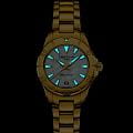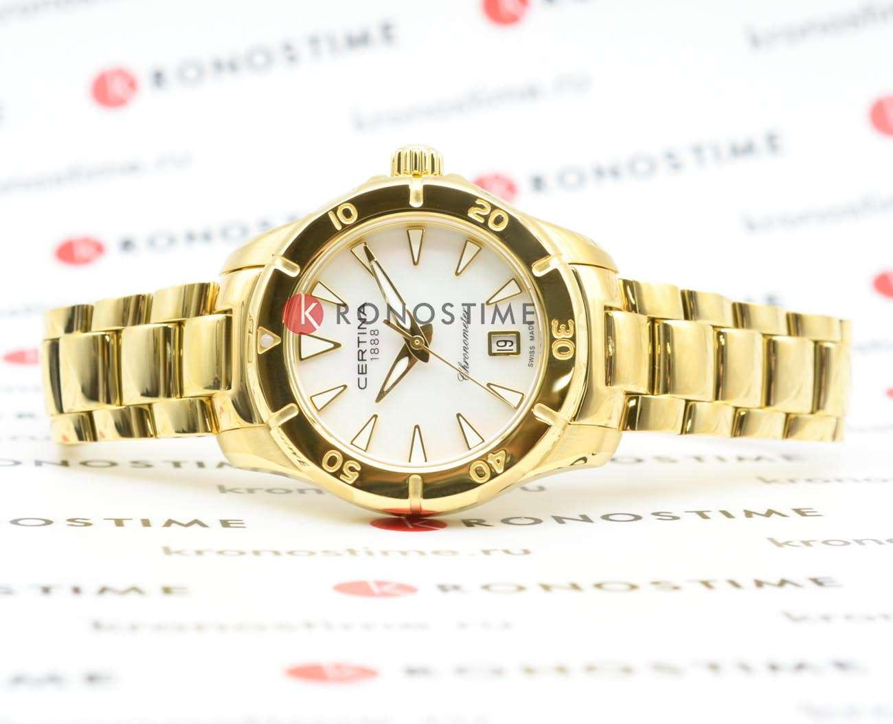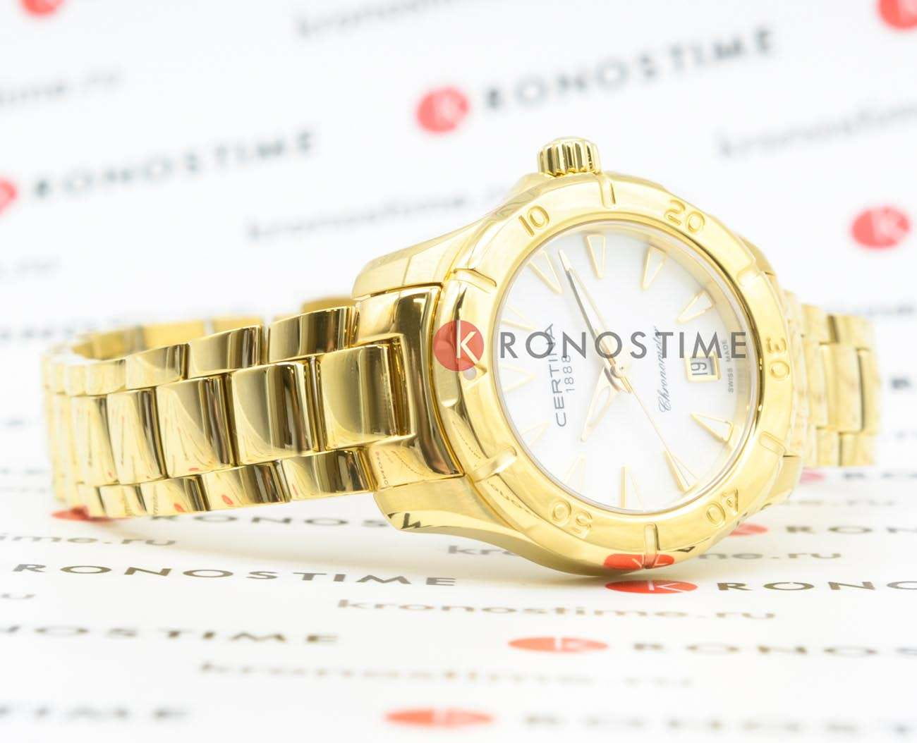 Компактный аксессуар создан по всем правилам дайверской тематики: вращающийся безельБезельВнешний ободок, закрепляющий стекло. В спортивных часах так называется поворотное кольцо с делениями на циферблате, выполняет роль таймера – замеряет отрезки времени на шкале. Неподвижный безель – элемент декора. Однонаправленно вращающийся безель на дайверских часах позволяет фиксировать моменты погружения и выныривания на поверхность., крупная индикация времени, завинчивающаяся заводная головка и задняя крышка. Стильно смотрится золотистый циферблат в сочетании с холодным блеском нержавеющей стали 316L с PVD-покрытиемPVDУльтратонкое покрытие наносится в технике вакуумного напыления, сочетает в себе нитрид титана особой прочности со слоем золота или оксида хрома. Несёт в себе декоративную или защитную функцию.. Часы оснащены швейцарским кварцевым калибром ETA F04.412 Precidrive™Precidrive™Инновационный кварцевый механизм Certina. Часы, оснащённые этим швейцарским калибром, приравниваются к точности к сертифицированным хронометрам, точность хода составляет +/-10 секунд в год., точность хода которого отмечена официальным сертификатом COSCСертификат COSCОфициальный сертификат, подтверждающий то, что часы ходят с особо высокой точностью. Для получения документа часы подвергаются тестовым испытаниям, разработанным швейцарским институтом тестирования хронометров COSC. Допустимая норма для механических часов -4/+6 секунд в день, для кварцевых моделей +/- 0,07 секунд в день.. Модель отличается максимальной водонепроницаемостью 200 метров, сапфировое стекло дополнено антибликовым покрытием. Функции: отображение даты, индикатор EOLEOLПредставляет собой систему, уведомляющую владельца часов о необходимости замены элемента питания. За 2 недели до полного разряда батарейки секундная стрелка перестаёт ходить чётко и начинает перепрыгивать на 3-4 деления.. Диаметр корпуса: 29 мм.