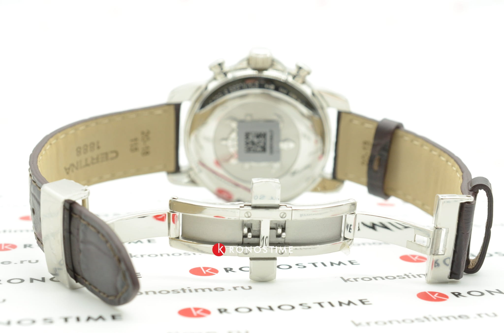 Аксессуар станет универсальным вариантом для делового или повседневного образа. Стильный хронографХронографФункция позволяет измерять отрезки времени с особой точностью: часы, минуты, секунды. Верным признаком хронографа является наличие на циферблате 3 дополнительных окошек-счётчиков. функционирует благодаря швейцарскому кварцевому механизму ETA G10.962 Precidrive™Precidrive™Инновационный кварцевый механизм Certina. Часы, оснащённые этим швейцарским калибром, приравниваются к точности к сертифицированным хронометрам, точность хода составляет +/-10 секунд в год.. Его абсолютная точность хода отмечена официальным сертификатом хронометра COSCСертификат COSCОфициальный сертификат, подтверждающий то, что часы ходят с особо высокой точностью. Для получения документа часы подвергаются тестовым испытаниям, разработанным швейцарским институтом тестирования хронометров COSC. Допустимая норма для механических часов -4/+6 секунд в день, для кварцевых моделей +/- 0,07 секунд в день.. Классический ремешок из натуральной кожи имеет поверхность с тиснением под кожу крокодила. Соблюдение DS ConceptDS ConceptDouble Security Concept, обозначает двойную надёжность и безупречную точность часов Certina. Двойная система защиты подразумевает обеспечение максимальной устойчивости к ударам и высоких показателей водонепроницаемости.. Сапфировое стекло с односторонним антибликовым покрытием. БезельБезельВнешний ободок, закрепляющий стекло. В спортивных часах так называется поворотное кольцо с делениями на циферблате, выполняет роль таймера – замеряет отрезки времени на шкале. Неподвижный безель – элемент декора. Однонаправленно вращающийся безель на дайверских часах позволяет фиксировать моменты погружения и выныривания на поверхность. со шкалой тахиметраТахиметрРазмеченная шкала, располагается на ободке или безеле часов. Тахиметр позволяет рассчитать скорость на определённом участке пути, расстояние измеряется в километрах или милях.. Водостойкость 100 метров. Люминесцентная подсветкаЛюминесцентное покрытиеПозволяет считывать показания времени в темноте. Производители наносят на стрелки, часовые индексы, безель или поверхность циферблата светонакопительный состав, дающий холодное свечение.. Защищённая заводная головка. Секундомер, GMTGMTОтображение времени второго часового пояса.Такая функция особенно актуальна для путешественников и бизнесменов,которые общаются с людьми из разных стран,теперь вы всегда будете знать,какой час у вашего партнёра или близкого человека., отображение числа, индикатор EOLEOLПредставляет собой систему, уведомляющую владельца часов о необходимости замены элемента питания. За 2 недели до полного разряда батарейки секундная стрелка перестаёт ходить чётко и начинает перепрыгивать на 3-4 деления.. Диаметр корпуса: 42 мм.