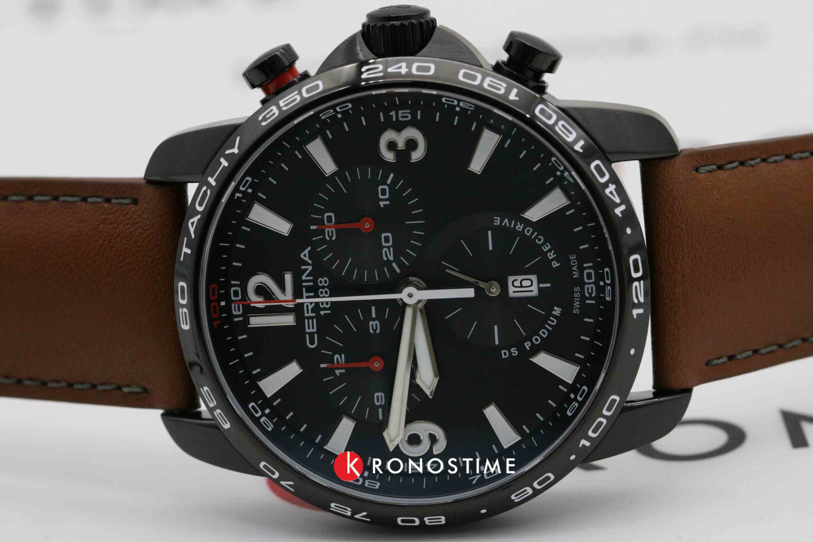 ХронографХронографФункция позволяет измерять отрезки времени с особой точностью: часы, минуты, секунды. Верным признаком хронографа является наличие на циферблате 3 дополнительных окошек-счётчиков. представлен в спортивном стиле. Харизматичная модель представляет собой отличный вариант для повседневного или делового образа, аксессуар поможет придать завершенности. Швейцарский инновационный кварцевый калибр ETA 251.264 Precidrive™Precidrive™Инновационный кварцевый механизм Certina. Часы, оснащённые этим швейцарским калибром, приравниваются к точности к сертифицированным хронометрам, точность хода составляет +/-10 секунд в год.. Антибликовое покрытие сапфирового стекла. Концепция DS ConceptDS ConceptDouble Security Concept, обозначает двойную надёжность и безупречную точность часов Certina. Двойная система защиты подразумевает обеспечение максимальной устойчивости к ударам и высоких показателей водонепроницаемости.. Водонепроницаемость до 20 бар. Ударопрочный корпусУдаропрочный корпусМеханизм заключён в корпус, выполненный из современных материалов, устойчивых к ударам, механическим повреждениям и падению с высоты: инновационный пластик, карбон, нержавеющая сталь, титан. из долговечной стали 316L с чёрным PVD-финишемPVDУльтратонкое покрытие наносится в технике вакуумного напыления, сочетает в себе нитрид титана особой прочности со слоем золота или оксида хрома. Несёт в себе декоративную или защитную функцию.. Завинчивающаяся задняя крышка. Защищённая заводная головка. Ремешок из натуральной кожи с . Показания времени с точностью до 1/100 секунды, отображение текущего числа, индикатор EOLEOLПредставляет собой систему, уведомляющую владельца часов о необходимости замены элемента питания. За 2 недели до полного разряда батарейки секундная стрелка перестаёт ходить чётко и начинает перепрыгивать на 3-4 деления., шкала тахиметраТахиметрРазмеченная шкала, располагается на ободке или безеле часов. Тахиметр позволяет рассчитать скорость на определённом участке пути, расстояние измеряется в километрах или милях.. Диаметр корпуса: 44 мм.