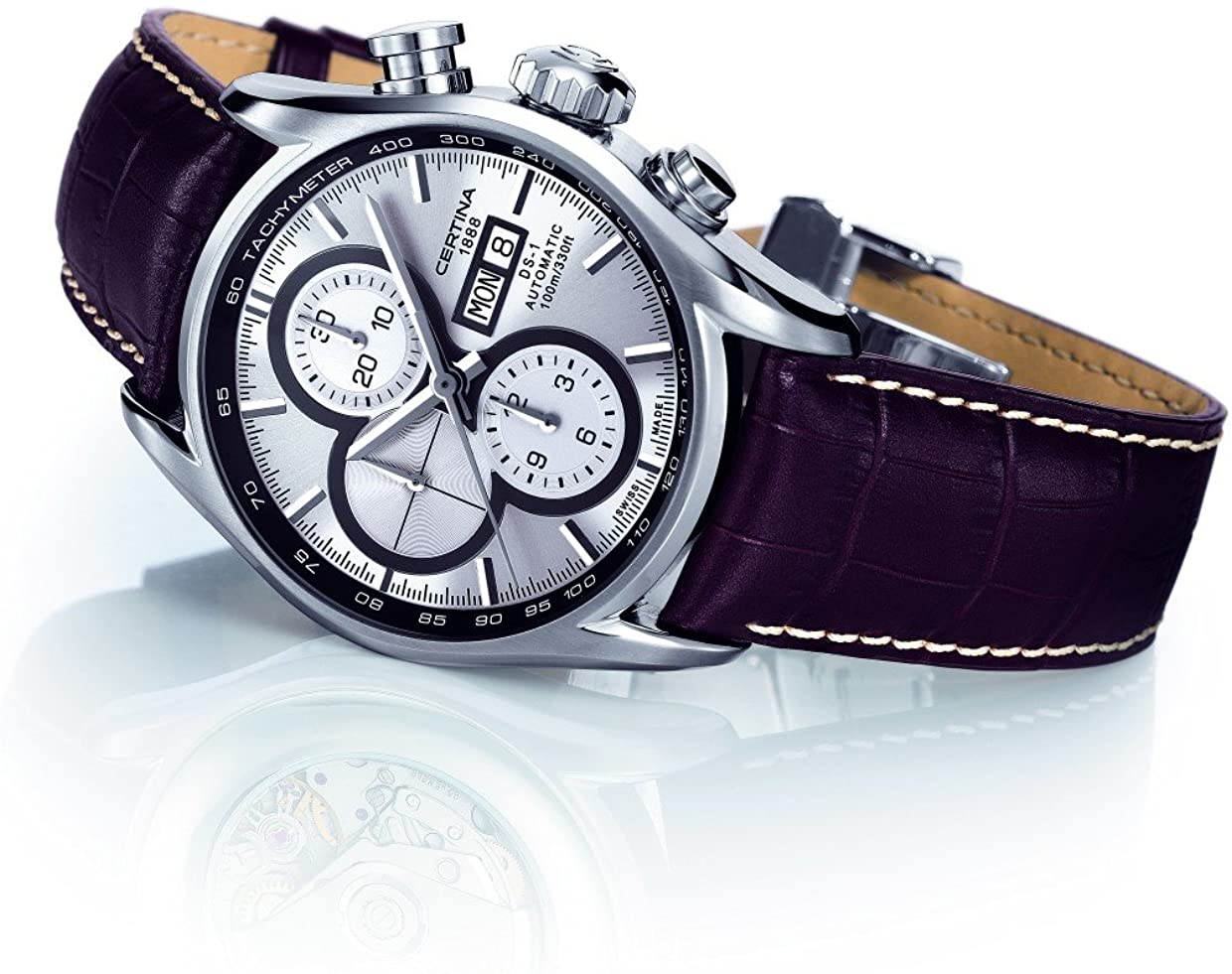 Часы Certina – это воплощение высочайшей точности и надежности часов. Беспрекословная точность и надежность, использование сложных технологий, инновационный подход в сочетании с традициями создания хронографов, которые марка пронесла через десятилетия, – все это позволяет компании предоставлять элитные, роскошные и стильные часы. На обратной стороне нанесено изображение черепахи в знак долговечности. Задняя крышка с повышенной прочностью, два кольца с уплотнением на заводной головке.
