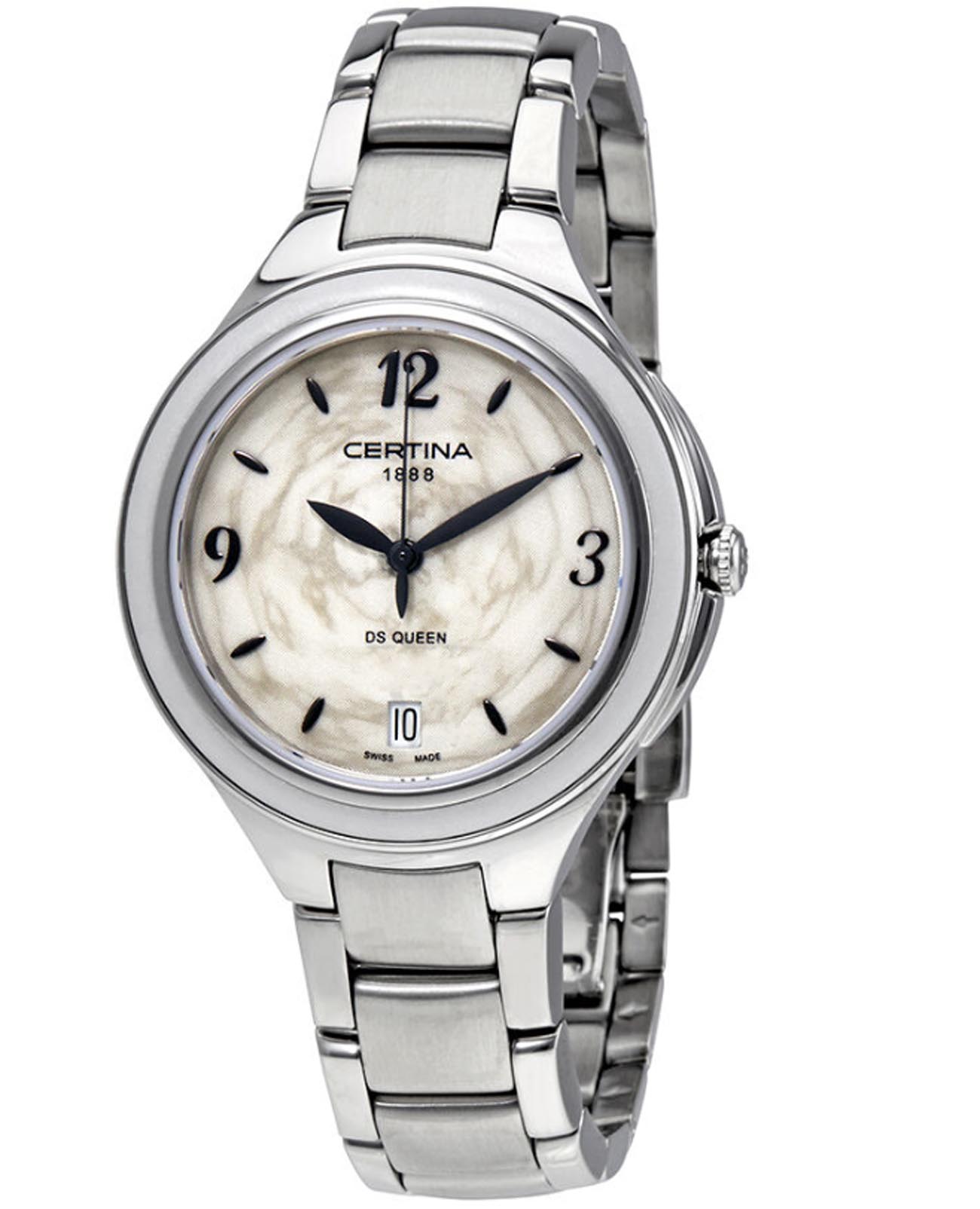 Женские швейцарские часы Certina DS Queen C0182101101700, кварцевый механизм с высокой точностью. Сапфировое стеклоСапфировое стеклоПрочный и надёжный материал из кристалла сапфира синтетического происхождения, характеризующийся особой твёрдостью и устойчивостью к царапинам и повреждениям. устойчивое к появлению царапин, обладающее высокой прозрачностью. Корпус изготовлен из нержавеющей стали. Окошко даты находится в положении 6 часов. Класс водозащиты: 100 метров, позволит плавать, нырять и заниматься другими водными видами спорта. Кожаный ремешок на застёжке-бабочке с кнопкамиЗастёжка "бабочка"Такой вид застёжки дополняется предохранителями, помогающими избежать случайного раскрытия браслета. Обладают изящным исполнением. .
