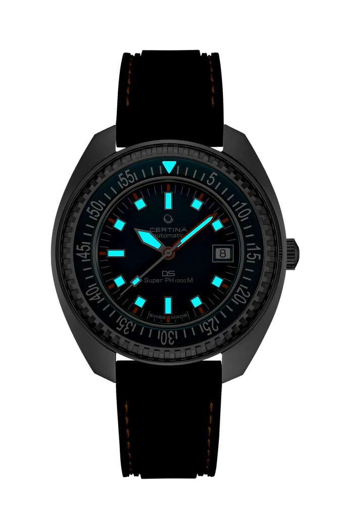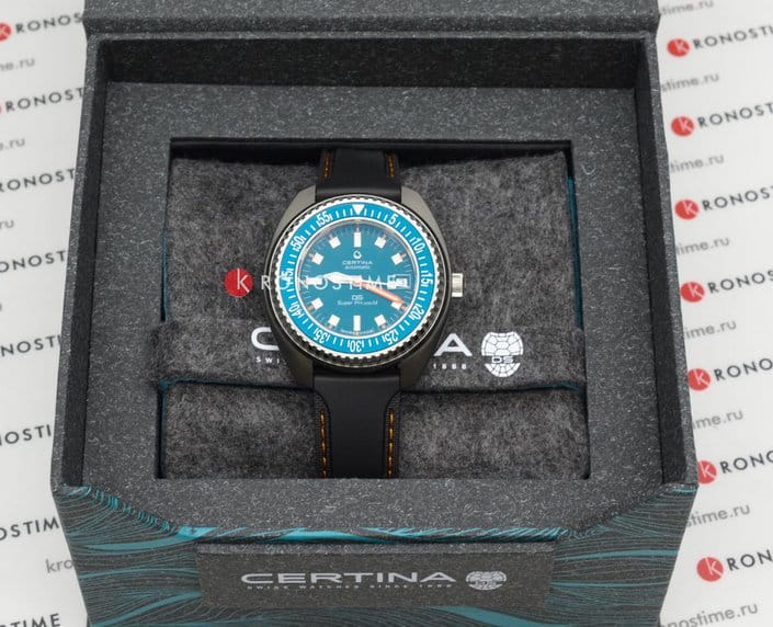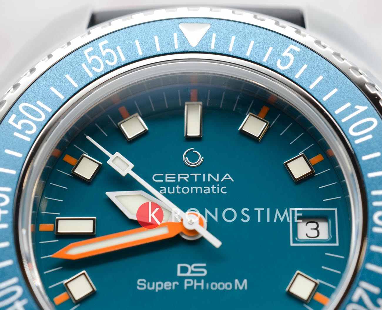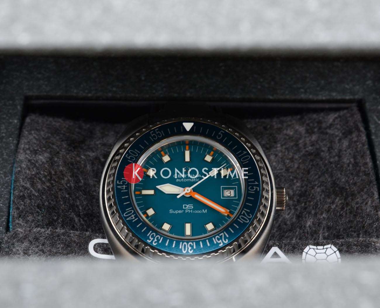 Certina DS SUPER PH1000M STC C024.907.17.041.10 – часы для поклонников ярких аксессуаров. Корпус изготовлен из высококачественной нержавеющей стали 316L с . Под твердым сапфировым стекломСапфировое стеклоПрочный и надёжный материал из кристалла сапфира синтетического происхождения, характеризующийся особой твёрдостью и устойчивостью к царапинам и повреждениям. с антибликовым покрытиемАнтибликовое покрытиеСлой оксида металла в 0,13-0,3 микрон, благодаря которому стекло часов не бликует и не отражает свет. Антибликовое покрытие уменьшает отражение света в 10 раз, обеспечивая отличную читаемость показателей циферблата. находится бирюзовый циферблат на котором вы найдете окошко даты в положении 3 часа, а также маркировку, покрытую люминесцентным покрытиемЛюминесцентное покрытиеПозволяет считывать показания времени в темноте. Производители наносят на стрелки, часовые индексы, безель или поверхность циферблата светонакопительный состав, дающий холодное свечение. Super-LumiNova. Все это приводится в действие автоматическим механизмом Powermatic 80Powermatic 80Эксклюзивный калибр от швейцарской компании ETA с увеличенным запасом хода до 80 часов за счёт удлинённой заводной пружины. Характеризуется улучшенной системой спуска со сниженным трением..611 с пружиной Nivachron™Nivachron™Специально разработанный инновационный сплав Nivachron™ повышает устойчивость часов к воздействию магнитных полей.. Класс водозащиты: 1000 метров, позволит плавать, нырять и заниматься другими водными видами спорта. Кожаный ремешок. БезельБезельВнешний ободок, закрепляющий стекло. В спортивных часах так называется поворотное кольцо с делениями на циферблате, выполняет роль таймера – замеряет отрезки времени на шкале. Неподвижный безель – элемент декора. Однонаправленно вращающийся безель на дайверских часах позволяет фиксировать моменты погружения и выныривания на поверхность. из нержавеющей стали с IP-покрытиемIP-покрытиеМетод ионного напыления. Демонстрирует повышенную устойчивость к истиранию, окислению и химическим веществам. Под воздействием высокого давления и температуры около 1500°C молекулы металла надёжно соединяются с частицами корпуса часов..