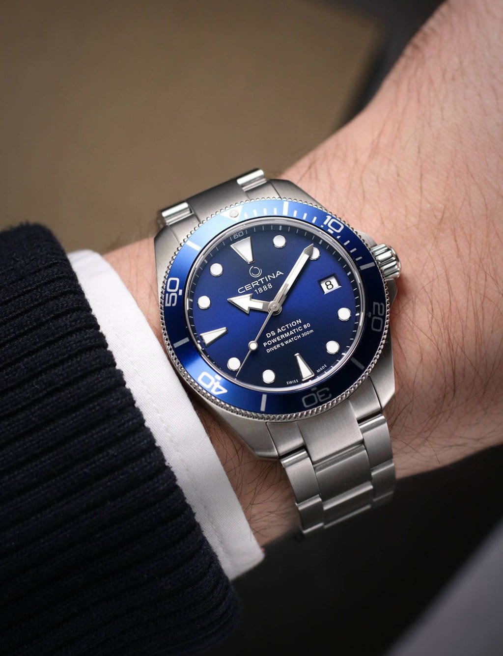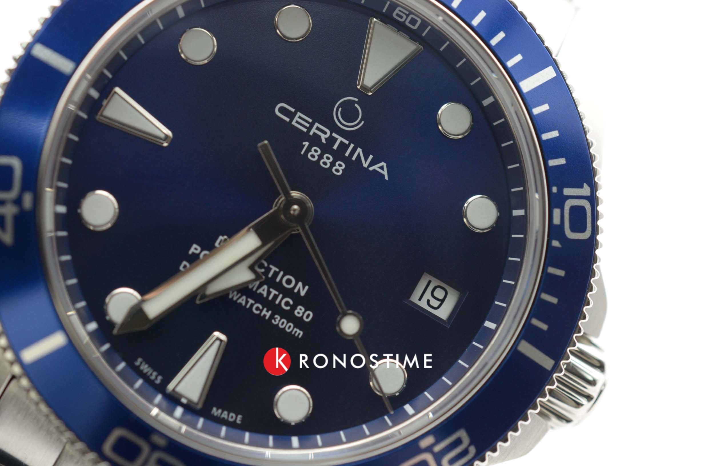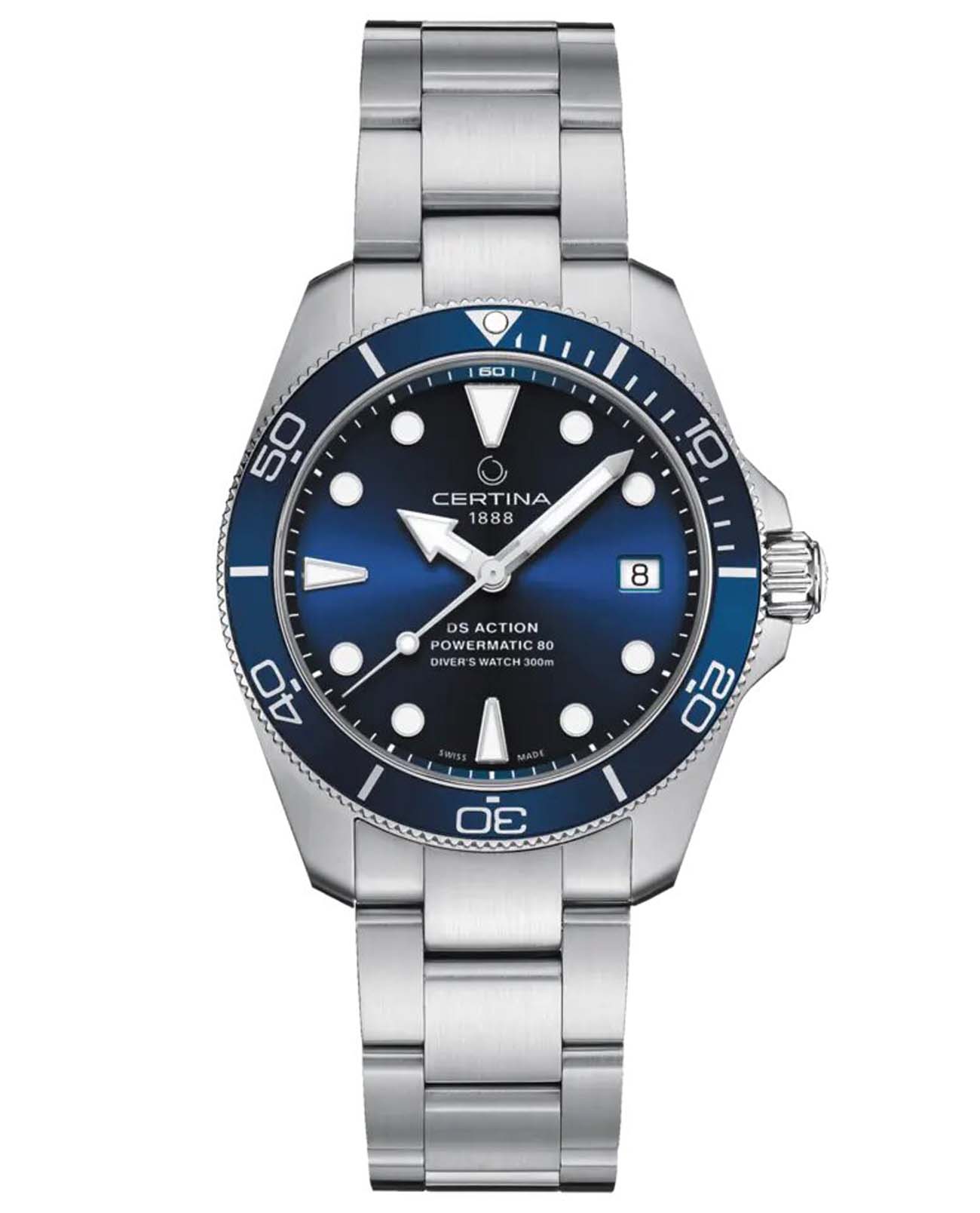 Швейцарские мужские механические часы Certina DS Action Diver Powermatic 80 C032.807.11.041.00 из коллекции DS Action отражают непревзойдённый стиль с дайверским характером. Модель имеет яркий акцент в виде синего циферблата. Крупная индикация времени позволяет считывать показания с циферблата в любой ситуации. Автоматический швейцарский калибр ETA Powermatic 80Powermatic 80Эксклюзивный калибр от швейцарской компании ETA с увеличенным запасом хода до 80 часов за счёт удлинённой заводной пружины. Характеризуется улучшенной системой спуска со сниженным трением. с резервом хода на 80 часов. Концепция DS ConceptDS ConceptDouble Security Concept, обозначает двойную надёжность и безупречную точность часов Certina. Двойная система защиты подразумевает обеспечение максимальной устойчивости к ударам и высоких показателей водонепроницаемости.. Сапфировое стекло. Алюминиевый вращающийся безельБезельВнешний ободок, закрепляющий стекло. В спортивных часах так называется поворотное кольцо с делениями на циферблате, выполняет роль таймера – замеряет отрезки времени на шкале. Неподвижный безель – элемент декора. Однонаправленно вращающийся безель на дайверских часах позволяет фиксировать моменты погружения и выныривания на поверхность.. Водонепроницаемость 300 метров. Люминесцентная подсветкаЛюминесцентное покрытиеПозволяет считывать показания времени в темноте. Производители наносят на стрелки, часовые индексы, безель или поверхность циферблата светонакопительный состав, дающий холодное свечение.. Стальной браслет с застёжкой, имеющей удлинение для дайверовУдлинение для дайверовЗастёжка с удлинением для дайверов представляет собой безопасное крепление, которое позволяет надевать часы поверх гидрокостюма. Гибкая застёжка удлиняется на 1-2 миллиметра.. Апертура даты. Диаметр корпуса: 38 мм. Производство и сборка: Швейцария.