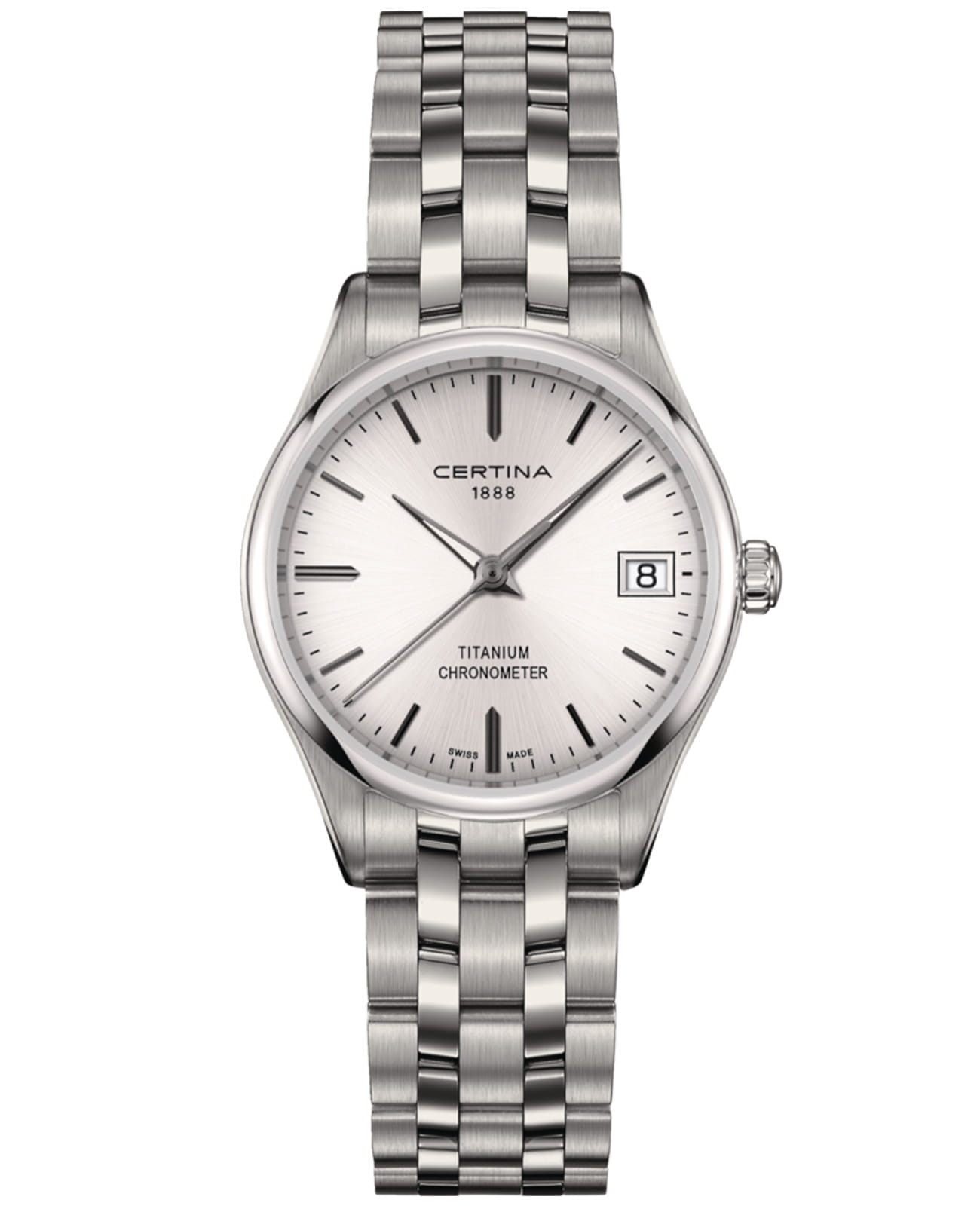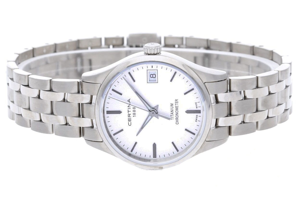 Женские швейцарские наручные часы с сапфировым стекломСапфировое стеклоПрочный и надёжный материал из кристалла сапфира синтетического происхождения, характеризующийся особой твёрдостью и устойчивостью к царапинам и повреждениям. Certina DS-8 Lady 30mm C033.251.44.031.00, кварцевый механизм с высокой точностью. Сапфировое стеклоСапфировое стеклоПрочный и надёжный материал из кристалла сапфира синтетического происхождения, характеризующийся особой твёрдостью и устойчивостью к царапинам и повреждениям. устойчивое к появлению царапин, обладающее высокой прозрачностью. Класс водозащиты: 100 метров, позволит плавать, нырять и заниматься другими водными видами спорта. Корпус и браслет часов изготовлены из титана. Браслет с застёжкой-бабочкой с кнопкамиЗастёжка "бабочка"Такой вид застёжки дополняется предохранителями, помогающими избежать случайного раскрытия браслета. Обладают изящным исполнением. . Окошко даты находятся в положении 3 часа.