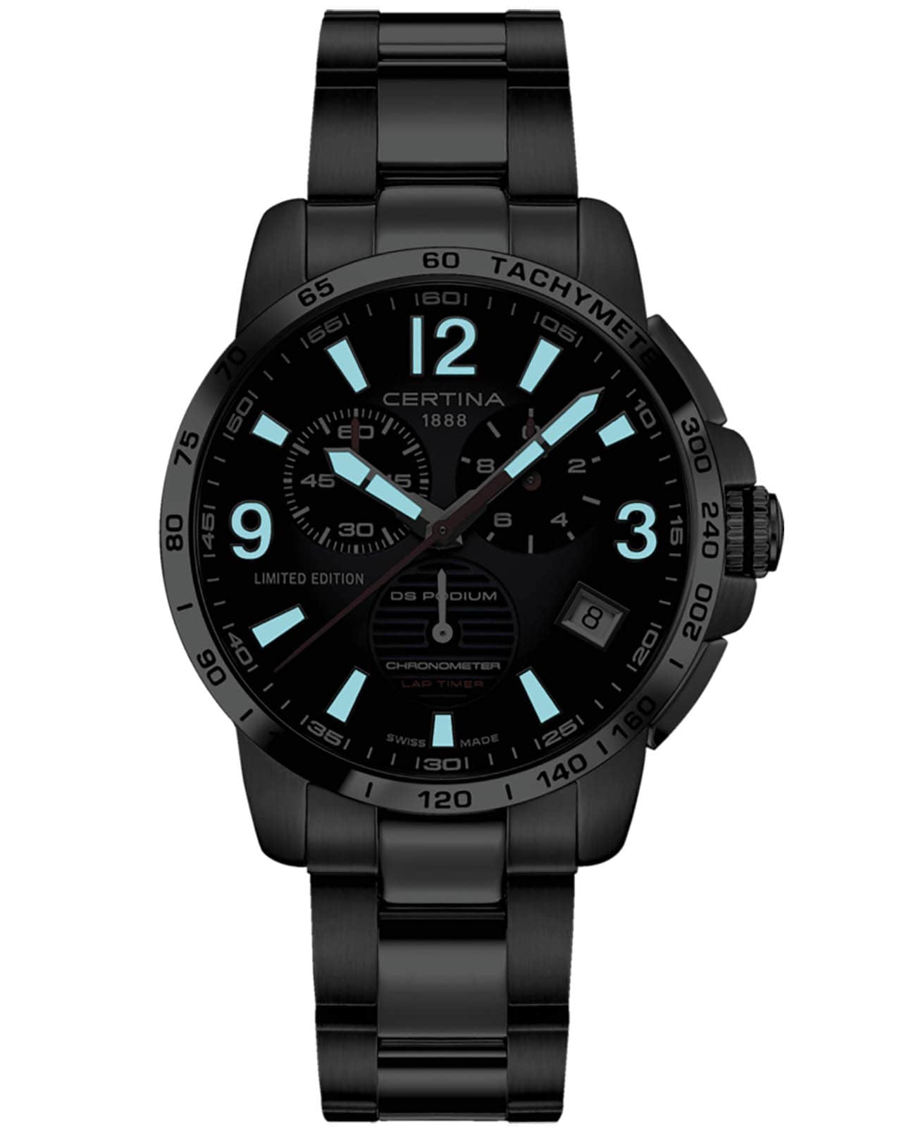 Наручные часы в спортивном стиле привлекают внимание синими деталями, что символизирует скоростное напряжение на гоночной трассе. Отличным дополнением стал браслет из нержавеющей стали. Кварцевый швейцарский механизм ETA G10.212 Precidrive™Precidrive™Инновационный кварцевый механизм Certina. Часы, оснащённые этим швейцарским калибром, приравниваются к точности к сертифицированным хронометрам, точность хода составляет +/-10 секунд в год. с повышенной точностью хода, подтверждённой сертификатом COSCСертификат COSCОфициальный сертификат, подтверждающий то, что часы ходят с особо высокой точностью. Для получения документа часы подвергаются тестовым испытаниям, разработанным швейцарским институтом тестирования хронометров COSC. Допустимая норма для механических часов -4/+6 секунд в день, для кварцевых моделей +/- 0,07 секунд в день.. Система DS ConceptDS ConceptDouble Security Concept, обозначает двойную надёжность и безупречную точность часов Certina. Двойная система защиты подразумевает обеспечение максимальной устойчивости к ударам и высоких показателей водонепроницаемости.. Двухстороннее антибликовое покрытие для стекла из сапфира. Стрелки и индексы с составом SuperLumiNovaЛюминесцентное покрытиеПозволяет считывать показания времени в темноте. Производители наносят на стрелки, часовые индексы, безель или поверхность циферблата светонакопительный состав, дающий холодное свечение.. Заводная головка с защитой. ХронографХронографФункция позволяет измерять отрезки времени с особой точностью: часы, минуты, секунды. Верным признаком хронографа является наличие на циферблате 3 дополнительных окошек-счётчиков., шкала тахиметраТахиметрРазмеченная шкала, располагается на ободке или безеле часов. Тахиметр позволяет рассчитать скорость на определённом участке пути, расстояние измеряется в километрах или милях., календарь, секундомер, индикатор EOLEOLПредставляет собой систему, уведомляющую владельца часов о необходимости замены элемента питания. За 2 недели до полного разряда батарейки секундная стрелка перестаёт ходить чётко и начинает перепрыгивать на 3-4 деления., Lap-функция измерения промежуточного времени (круга). Диаметр корпуса: 42 мм.