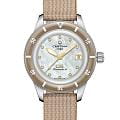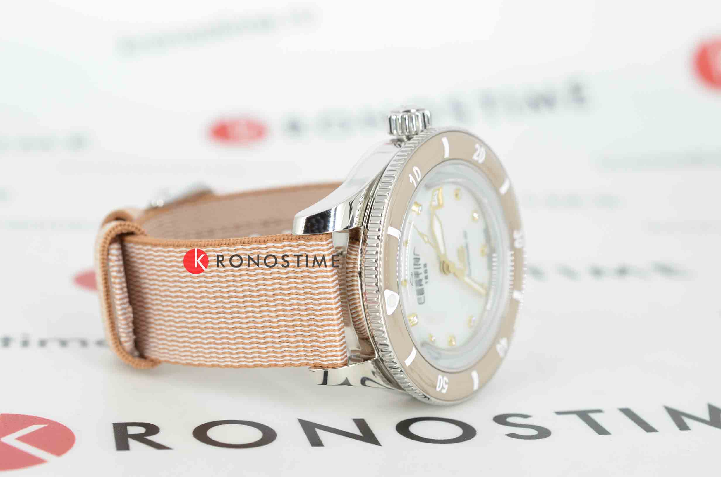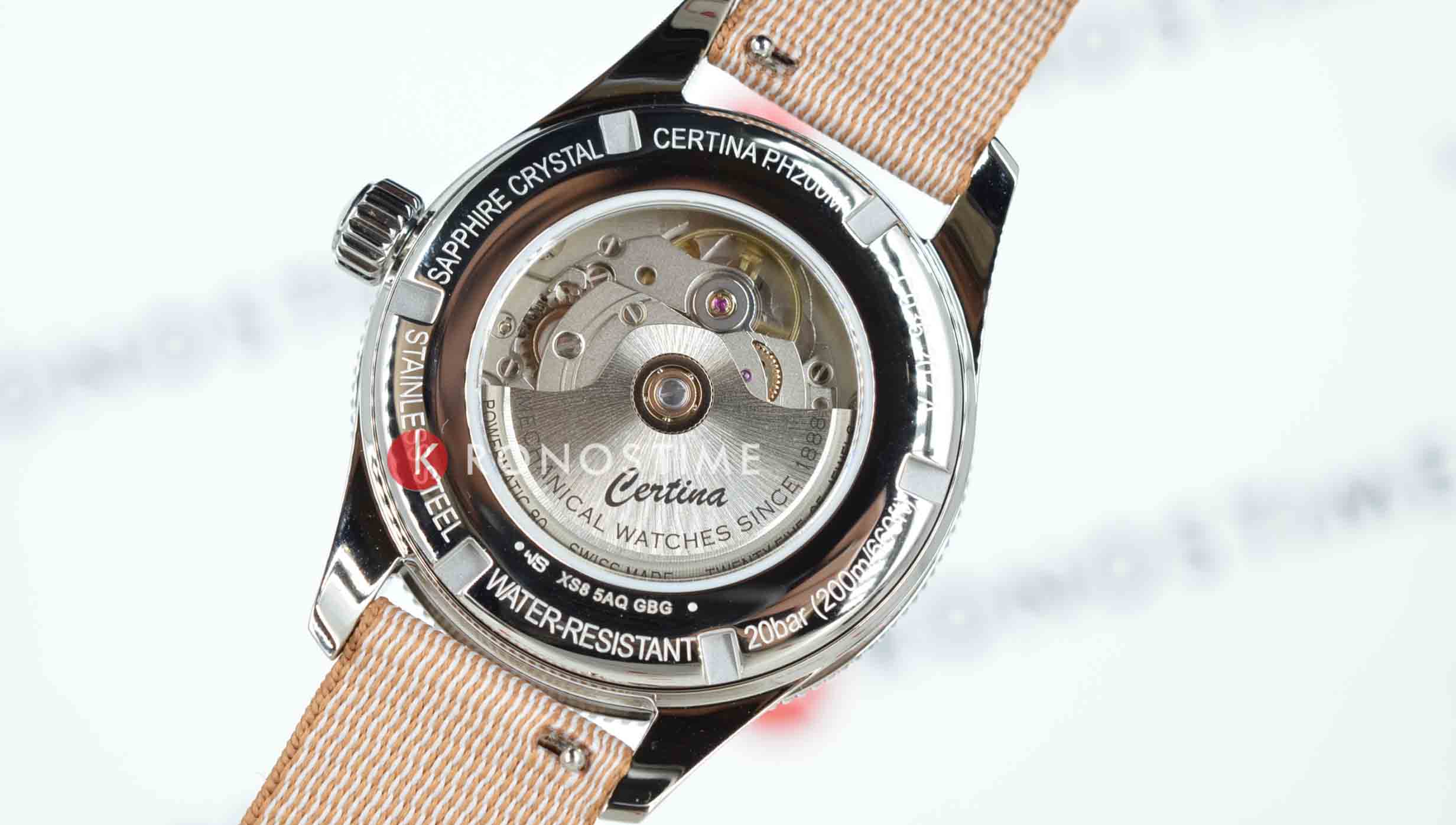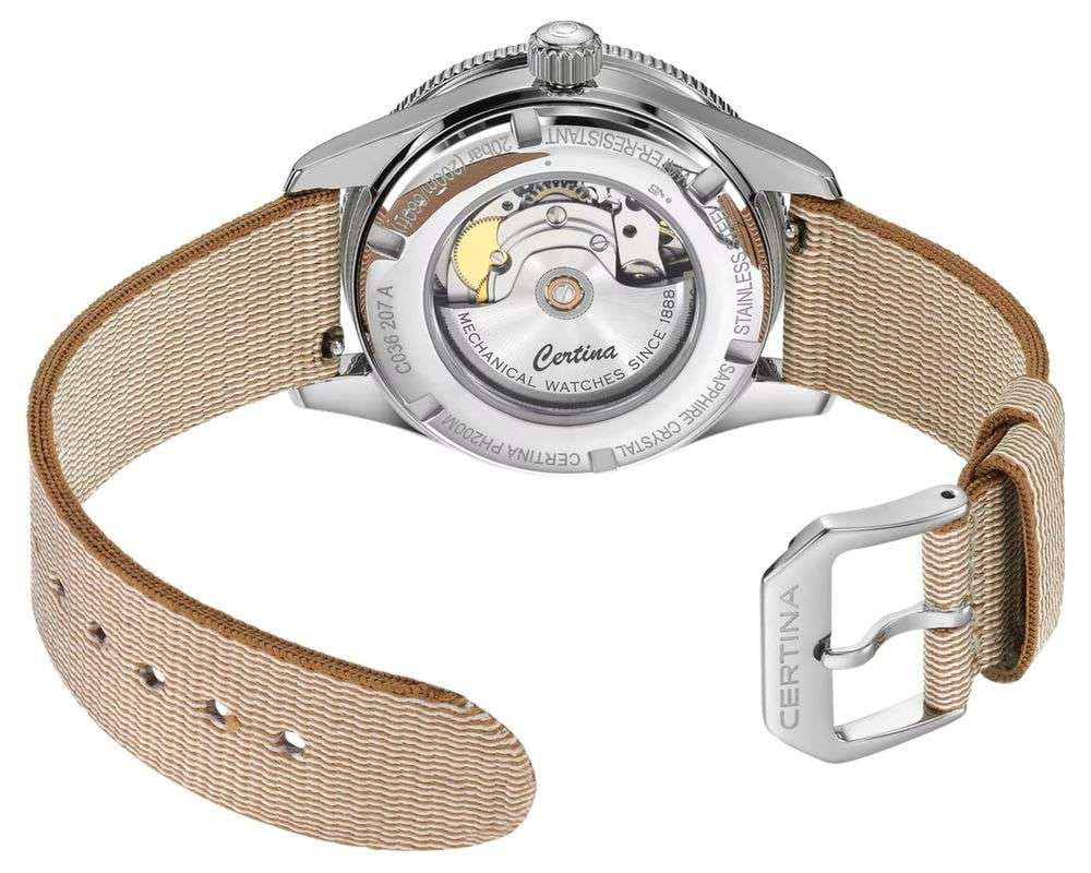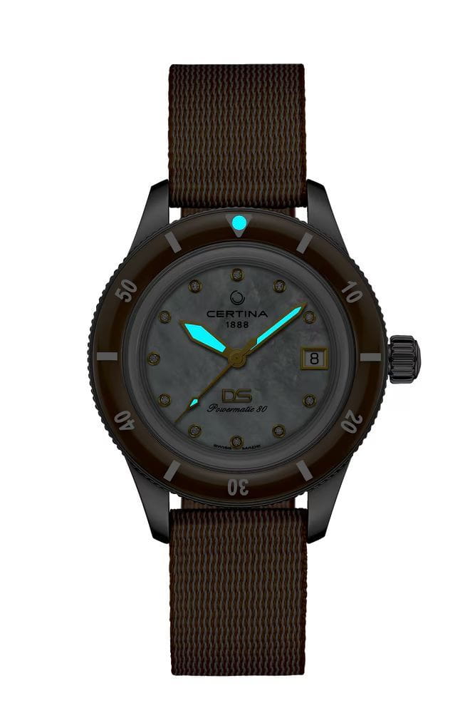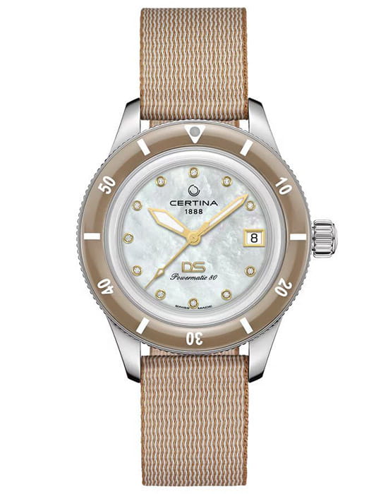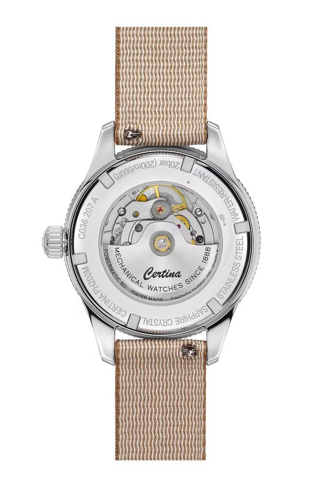 Модель Certina C036.207.18.116.00 из коллекции DS PH200M сочетает в себе элегантный дизайн и высокие технические характеристики.  Корпус диаметром 39 мм выполнен из нержавеющей стали 316L, обеспечивая прочность и устойчивость к коррозии.  Циферблат из белого перламутра украшен одиннадцатью бриллиантами и дополнен стрелками и индексами с покрытием из розового золота, покрытыми люминесцентным покрытиемЛюминесцентное покрытиеПозволяет считывать показания времени в темноте. Производители наносят на стрелки, часовые индексы, безель или поверхность циферблата светонакопительный состав, дающий холодное свечение. для отличной читаемости в темноте.