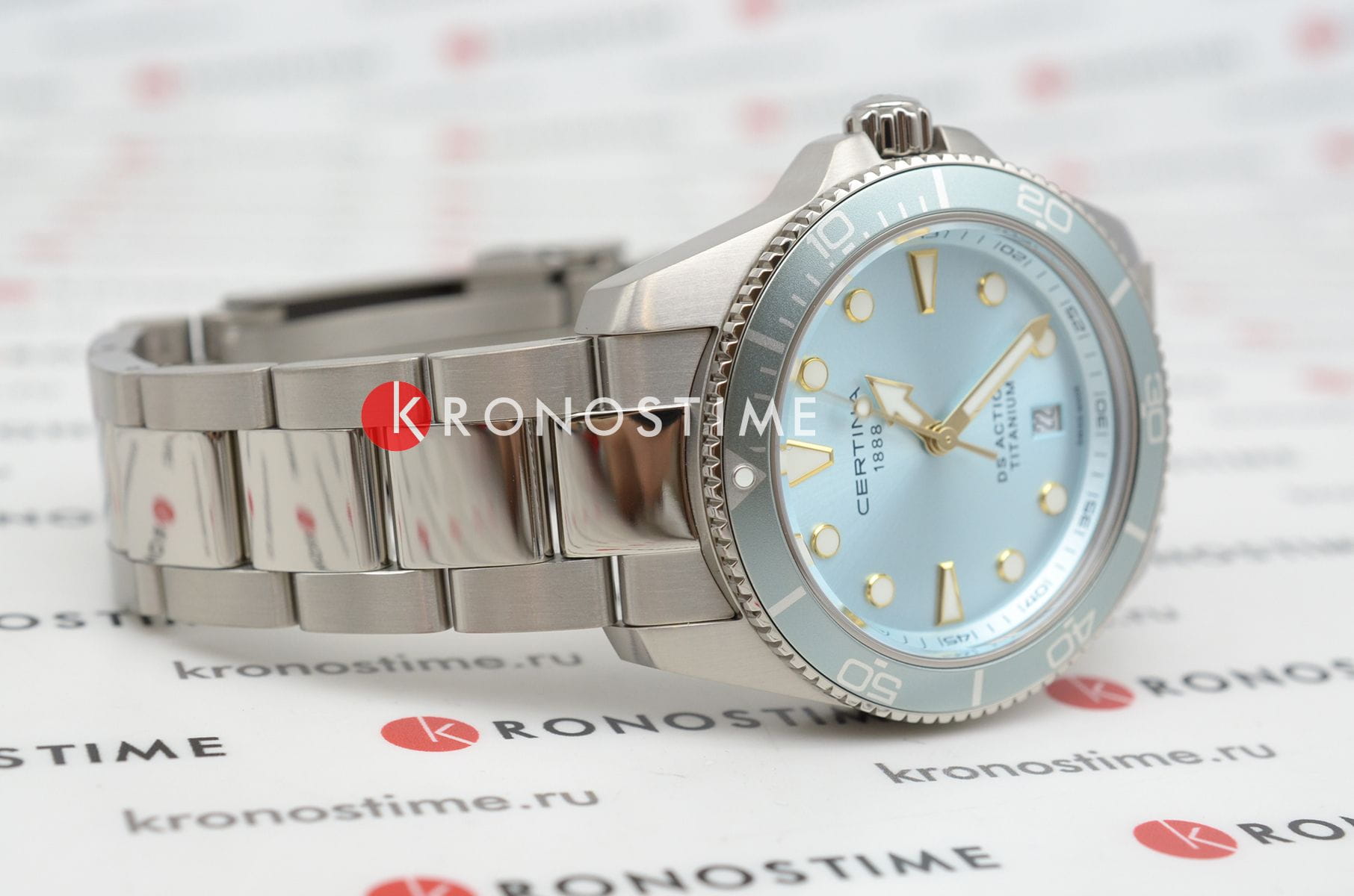 Certina DS Action C048.410.44.351.00 – элегантные мужские часы, сочетающие современный дизайн и высокую функциональность. Корпус диаметром 40 мм выполнен из титана, что обеспечивает лёгкость, прочность и гипоаллергенные свойства. Светло-голубой циферблат с метками и стрелками, покрытыми люминесцентным покрытиемЛюминесцентное покрытиеПозволяет считывать показания времени в темноте. Производители наносят на стрелки, часовые индексы, безель или поверхность циферблата светонакопительный состав, дающий холодное свечение., обеспечивает отличную читаемость в любых условиях, а его поверхность защищена сапфировым стекломСапфировое стеклоПрочный и надёжный материал из кристалла сапфира синтетического происхождения, характеризующийся особой твёрдостью и устойчивостью к царапинам и повреждениям. с антибликовым покрытиемАнтибликовое покрытиеСлой оксида металла в 0,13-0,3 микрон, благодаря которому стекло часов не бликует и не отражает свет. Антибликовое покрытие уменьшает отражение света в 10 раз, обеспечивая отличную читаемость показателей циферблата., устойчивым к царапинам.БезельБезельВнешний ободок, закрепляющий стекло. В спортивных часах так называется поворотное кольцо с делениями на циферблате, выполняет роль таймера – замеряет отрезки времени на шкале. Неподвижный безель – элемент декора. Однонаправленно вращающийся безель на дайверских часах позволяет фиксировать моменты погружения и выныривания на поверхность. с PVD-покрытиемPVDУльтратонкое покрытие наносится в технике вакуумного напыления, сочетает в себе нитрид титана особой прочности со слоем золота или оксида хрома. Несёт в себе декоративную или защитную функцию.. Часы оснащены швейцарским кварцевым механизмом ETA F06.412 с технологией Precidrive™Precidrive™Инновационный кварцевый механизм Certina. Часы, оснащённые этим швейцарским калибром, приравниваются к точности к сертифицированным хронометрам, точность хода составляет +/-10 секунд в год., обеспечивающей исключительную точность хода. Функция EOLEOLПредставляет собой систему, уведомляющую владельца часов о необходимости замены элемента питания. За 2 недели до полного разряда батарейки секундная стрелка перестаёт ходить чётко и начинает перепрыгивать на 3-4 деления. (индикатор окончания заряда батареи) предупреждает о необходимости замены элемента питания. Браслет из титана оснащён системой быстрой замены, позволяющей легко адаптировать стиль часов. Водонепроницаемость 300 метров (30 бар) делает модель идеальным выбором для плавания и дайвинга.