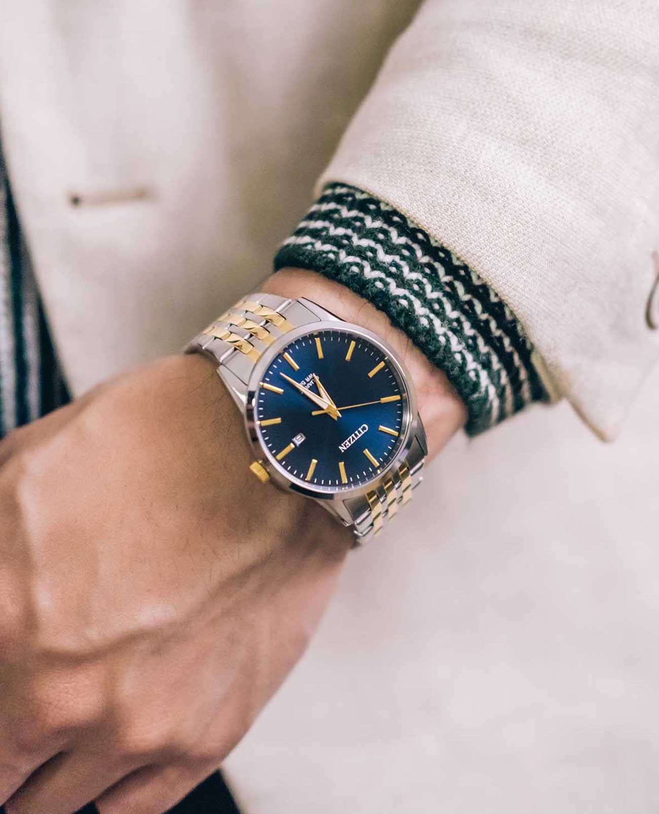 Часы Citizen BI5006-81L сочетают в себе японское качество, современный дизайн и надежность кварцевого механизма Citizen G111. Круглый корпус диаметром 39 мм выполнен из прочной нержавеющей стали, что обеспечивает долговечность и стильный внешний вид. Синий циферблат украшен метками в виде штрихов, а также дополнен окошком календаря с отображением даты и дня недели в позиции «3 часа». Стрелки с люминесцентным покрытиемЛюминесцентное покрытиеПозволяет считывать показания времени в темноте. Производители наносят на стрелки, часовые индексы, безель или поверхность циферблата светонакопительный состав, дающий холодное свечение., что обеспечивает отличную видимость в темноте. Минеральное стеклоМинеральное стеклоМинеральное стекло представляет собой искусственно выращенный минерал кварца. Такое стекло отличается особой устойчивостью к повреждениям и царапинам. Уступает по некоторым качествам сапфировому стеклу. защищает циферблат от царапин и повреждений. Рифленая заводная головка подчеркивает элегантность и практичность модели. Стальной браслет с частичным золотистым IP-покрытиемIP-покрытиеМетод ионного напыления. Демонстрирует повышенную устойчивость к истиранию, окислению и химическим веществам. Под воздействием высокого давления и температуры около 1500°C молекулы металла надёжно соединяются с частицами корпуса часов. оснащен надежной раскладной застёжкойРаскладная застёжкаТакой тип застёжки используется только на браслетах из металла. Она никогда не раскрывается полностью, происходит разделение на 2 и более частей. Раскладывающая застёжка снизит вероятность потери часов к минимуму., что обеспечивает комфортное ношение и подходит для любого случая. Водозащита до 50 метров позволяет не бояться случайных брызг и дождя.
