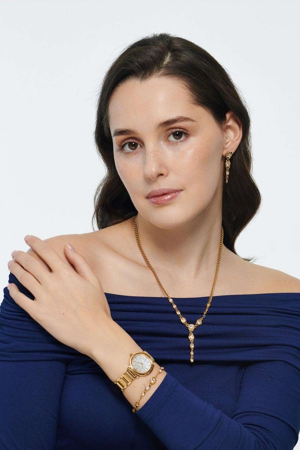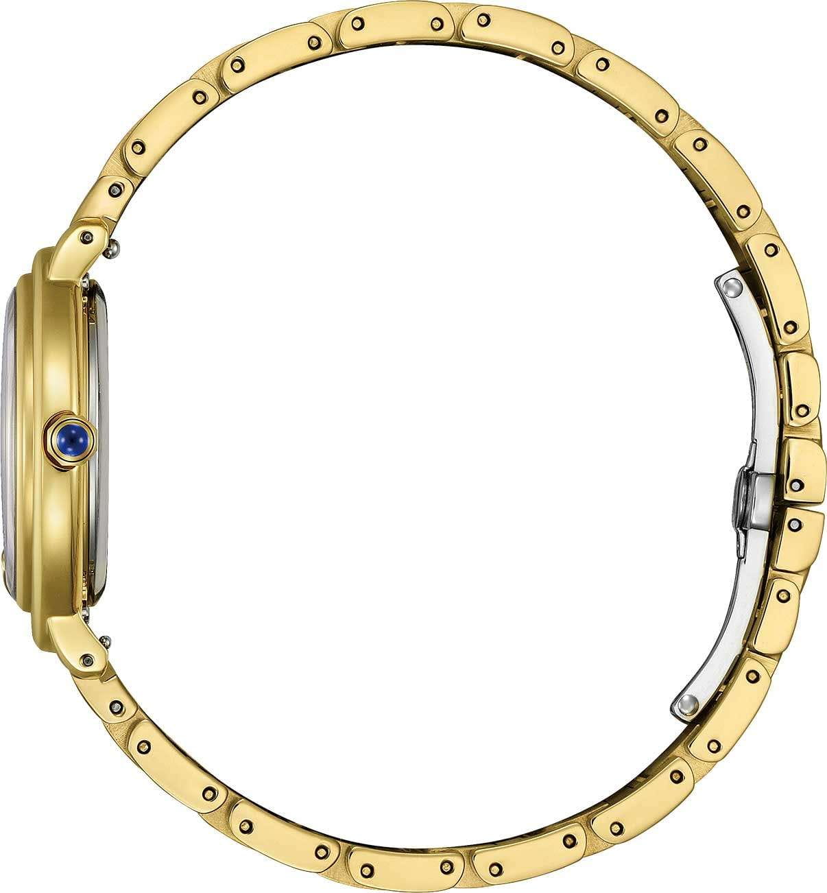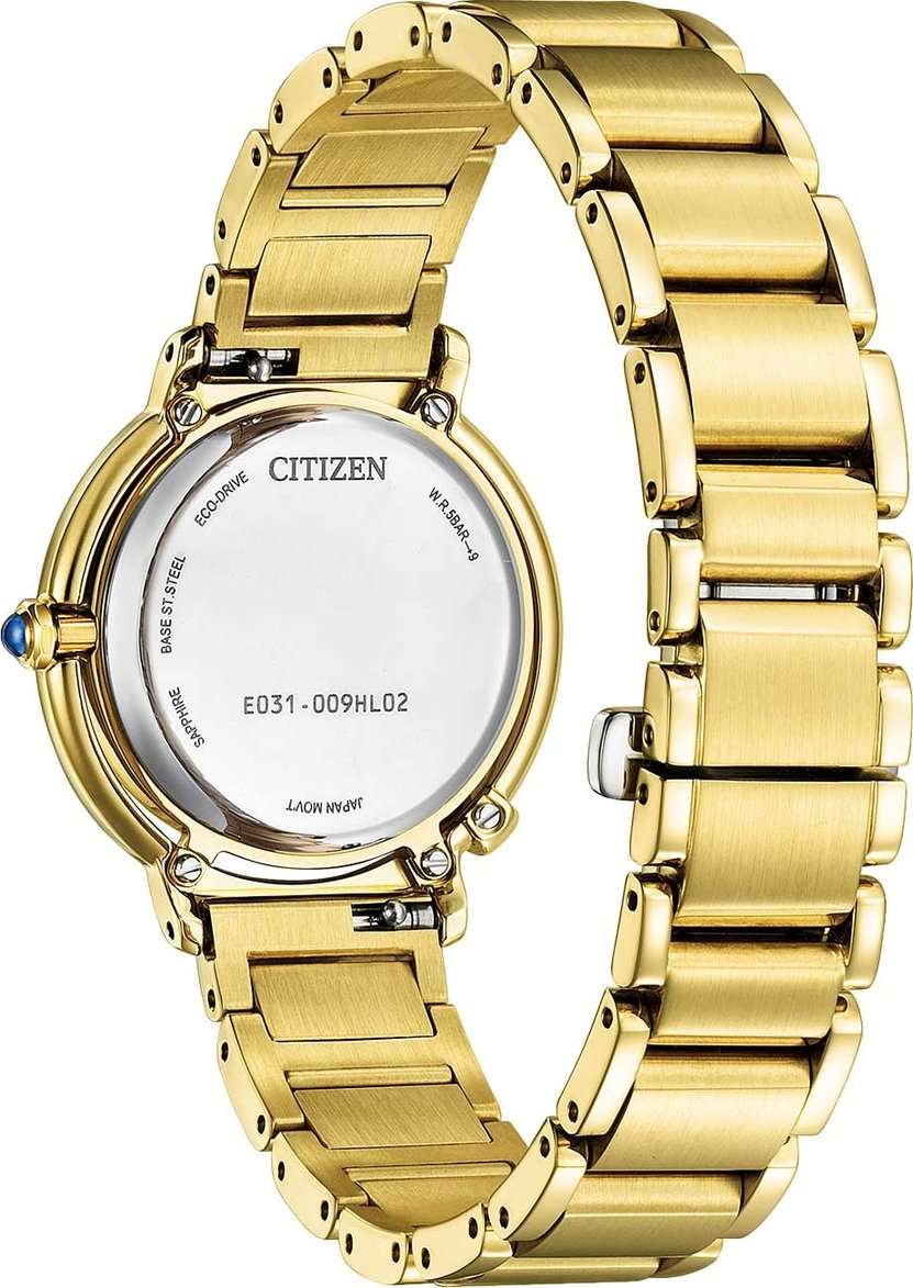 Часы Citizen EM1092-64D – это элегантная модель, созданная в Японии и сочетающая в себе современные технологии и изысканный дизайн. Надежный кварцевый механизм Citizen E031 с инновационной системой Eco-Drive работает от солнечной энергии и не требует замены батарейки, обеспечивая запас хода до 180 дней. Корпус и браслет часов выполнены из нержавеющей стали с золотым IP-покрытиемIP-покрытиеМетод ионного напыления. Демонстрирует повышенную устойчивость к истиранию, окислению и химическим веществам. Под воздействием высокого давления и температуры около 1500°C молекулы металла надёжно соединяются с частицами корпуса часов. и украшен тремя кристаллами, что придает аксессуару особое сияние. Перламутровый голубой циферблат с лаконичными метками защищен выпуклым сапфировым стекломСапфировое стеклоПрочный и надёжный материал из кристалла сапфира синтетического происхождения, характеризующийся особой твёрдостью и устойчивостью к царапинам и повреждениям., устойчивым к царапинам. Заводная головка декорирована камнем в форме кабошона, а задняя крышка закреплена на четырех винтах. Стальной браслет оснащен застежкой «бабочка»Застёжка "бабочка"Такой вид застёжки дополняется предохранителями, помогающими избежать случайного раскрытия браслета. Обладают изящным исполнением. и системой быстрой замены, что позволяет легко менять стиль часов в зависимости от вашего настроения. В комплекте также идет сменный белый ремешок с такой же застежкой. Водозащита 50WR позволяет не беспокоиться о случайном контакте с водой. Компактные размеры корпуса (диаметр 31,2 мм, толщина 7,8 мм, вес 71 г) обеспечивают комфортное ношение каждый день. Эти часы станут великолепным дополнением к любому образу и подчеркнут вашу индивидуальность.