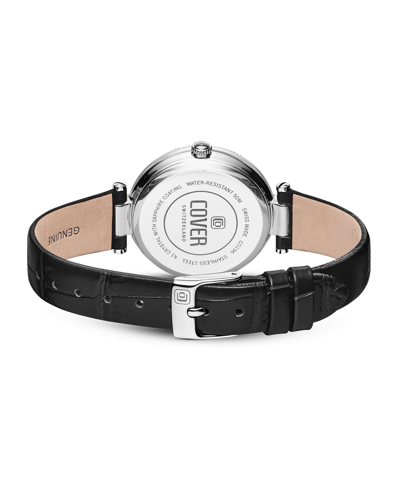 Женские наручные часы Cover CO196.04 из коллекции Fly Me To The Moon сочетают в себе элегантность и точность швейцарского производства. Модель обладает круглым корпусом диаметром 32 мм, изготовленным из нержавеющей стали с полированным покрытием. Браслет выполнен из черной кожаной ремешка, оснащенный классической застежкой для комфортного ношения. Белый перламутровый циферблат украшен 11 кристаллами, которые выполняют роль индексов часов, а также имеет окно фаз Луны на «6 часах» и апертуру даты на «3 часах». Для защиты используется стекло с антибликовым покрытиемАнтибликовое покрытиеСлой оксида металла в 0,13-0,3 микрон, благодаря которому стекло часов не бликует и не отражает свет. Антибликовое покрытие уменьшает отражение света в 10 раз, обеспечивая отличную читаемость показателей циферблата., обеспечивающее превосходную читаемость времени при любых условиях освещения. Часы работают на высокоточном кварцевом механизме, гарантирующем исключительную точность хода без необходимости подзаводки. Водонепроницаемость часов достигает 5 атмосфер (WR 50), что позволяет использовать их в повседневной жизни, однако не рекомендуется для контакта с водой во время плавания или дайвинга. Эти швейцарские часы станут идеальным дополнением как классического, так и повседневного образа женщины, ценящей элегантность и качество.