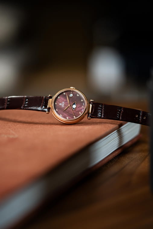 Женские часы Cover Moon CO196.07 - это аксессуар для истинных леди из коллекции Fly Me To The Moon. Часы работают на кварцевом калибре ETA. Циферблат выполнен в коричневом перламутровом исполнении, создавая игру света при каждом движении запястья, и украшен 11 кристаллами Swarovski, которые служат часовым индикатором, добавляя блики света и роскоши. Кроме того, модель имеет окно фаз Луны на «6 часах» и апертуру даты на «3 часах», что делает ее функциональной для ценителей астрономических усложнений. Часы имеют 32-миллиметровый корпус из нержавеющей стали с PVD-покрытиемPVDУльтратонкое покрытие наносится в технике вакуумного напыления, сочетает в себе нитрид титана особой прочности со слоем золота или оксида хрома. Несёт в себе декоративную или защитную функцию. цвета розового золота. Водонепроницаемость часов достигает 5 атмосфер (WR 50), что позволяет использовать их в повседневной жизни, однако не рекомендуется для контакта с водой во время плавания или дайвинга. Маркировка «Swiss Made». Кожаный ремешок на классической застежке.