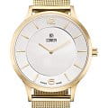 Женские наручные часы Cover CO2037.08 из коллекции Essential сочетают в себе классический дизайн и высокую точность швейцарского производства. Модель обладает круглым корпусом диаметром 38 мм, изготовленным из нержавеющей стали с PVD-покрытиемPVDУльтратонкое покрытие наносится в технике вакуумного напыления, сочетает в себе нитрид титана особой прочности со слоем золота или оксида хрома. Несёт в себе декоративную или защитную функцию., что придает изделию благородный внешний вид. Для защиты используется сапфировое стеклоСапфировое стеклоПрочный и надёжный материал из кристалла сапфира синтетического происхождения, характеризующийся особой твёрдостью и устойчивостью к царапинам и повреждениям. с антибликовым покрытиемАнтибликовое покрытиеСлой оксида металла в 0,13-0,3 микрон, благодаря которому стекло часов не бликует и не отражает свет. Антибликовое покрытие уменьшает отражение света в 10 раз, обеспечивая отличную читаемость показателей циферблата., обеспечивающее прочную защиту от царапин и превосходную читаемость времени даже при ярком свете. Часы работают на высокоточном кварцевом механизме, гарантирующем исключительную точность хода с погрешностью около 20 секунд в месяц. Браслет "миланского плетения" выполнен из нержавеющей стали с золотистым PVD-покрытиемPVDУльтратонкое покрытие наносится в технике вакуумного напыления, сочетает в себе нитрид титана особой прочности со слоем золота или оксида хрома. Несёт в себе декоративную или защитную функцию. и оснащен раскладным замком, который легко можно подогнать по руке. Водонепроницаемость достигает 5 атмосфер (50 метров), что позволяет использовать их во время дождя и мытья рук, но не рекомендуется для плавания. Эти швейцарские часы станут идеальным дополнением как классического, так и современного образа.