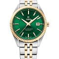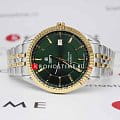 Циферблат зеленого цвета с текстурированным узором и контрастными штрихами, защищен минеральным стекломМинеральное стеклоМинеральное стекло представляет собой искусственно выращенный минерал кварца. Такое стекло отличается особой устойчивостью к повреждениям и царапинам. Уступает по некоторым качествам сапфировому стеклу. с сапфировым напылением. Браслет из нержавеющей стали с частичным PVD-покрытиемPVDУльтратонкое покрытие наносится в технике вакуумного напыления, сочетает в себе нитрид титана особой прочности со слоем золота или оксида хрома. Несёт в себе декоративную или защитную функцию. цвета золота.