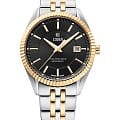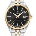 Циферблат черного цвета с текстурированным узором и контрастными штрихами, защищен минеральным стекломМинеральное стеклоМинеральное стекло представляет собой искусственно выращенный минерал кварца. Такое стекло отличается особой устойчивостью к повреждениям и царапинам. Уступает по некоторым качествам сапфировому стеклу. с сапфировым напылением. Браслет из нержавеющей стали с частичным PVD-покрытиемPVDУльтратонкое покрытие наносится в технике вакуумного напыления, сочетает в себе нитрид титана особой прочности со слоем золота или оксида хрома. Несёт в себе декоративную или защитную функцию. цвета желтого золота. БезельБезельВнешний ободок, закрепляющий стекло. В спортивных часах так называется поворотное кольцо с делениями на циферблате, выполняет роль таймера – замеряет отрезки времени на шкале. Неподвижный безель – элемент декора. Однонаправленно вращающийся безель на дайверских часах позволяет фиксировать моменты погружения и выныривания на поверхность. рифленый с PVD-покрытиемPVDУльтратонкое покрытие наносится в технике вакуумного напыления, сочетает в себе нитрид титана особой прочности со слоем золота или оксида хрома. Несёт в себе декоративную или защитную функцию..