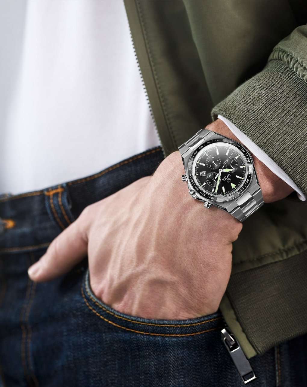 Мужские наручные часы-хронографХронографФункция позволяет измерять отрезки времени с особой точностью: часы, минуты, секунды. Верным признаком хронографа является наличие на циферблате 3 дополнительных окошек-счётчиков. Cover CO212.01 из коллекции Iconosteel сочетают в себе классический дизайн и надежность современных технологий. Часы оснащены кварцевым механизмом с модулем хронографа Ronda 5040.D, они обеспечивают точность и надежность в каждом моменте. Модель обладает круглым корпусом диаметром 41 мм, изготовленным из нержавеющей стали, что обеспечивает высокую устойчивость к внешним воздействиям. Браслет выполнен из нержавеющей стали с раскладной застёжкойРаскладная застёжкаТакой тип застёжки используется только на браслетах из металла. Она никогда не раскрывается полностью, происходит разделение на 2 и более частей. Раскладывающая застёжка снизит вероятность потери часов к минимуму., гарантирующей комфортное ношение и безопасность. Черный циферблат оснащен окном даты на «4 часах» и стрелками с люминесцентным покрытиемЛюминесцентное покрытиеПозволяет считывать показания времени в темноте. Производители наносят на стрелки, часовые индексы, безель или поверхность циферблата светонакопительный состав, дающий холодное свечение.. Для защиты используется сапфировое стеклоСапфировое стеклоПрочный и надёжный материал из кристалла сапфира синтетического происхождения, характеризующийся особой твёрдостью и устойчивостью к царапинам и повреждениям., обеспечивающее прочную защиту от царапин и антибликовый эффект. На черный безельБезельВнешний ободок, закрепляющий стекло. В спортивных часах так называется поворотное кольцо с делениями на циферблате, выполняет роль таймера – замеряет отрезки времени на шкале. Неподвижный безель – элемент декора. Однонаправленно вращающийся безель на дайверских часах позволяет фиксировать моменты погружения и выныривания на поверхность. с PVD-покрытиемPVDУльтратонкое покрытие наносится в технике вакуумного напыления, сочетает в себе нитрид титана особой прочности со слоем золота или оксида хрома. Несёт в себе декоративную или защитную функцию. нанесена шкала тахиметраТахиметрРазмеченная шкала, располагается на ободке или безеле часов. Тахиметр позволяет рассчитать скорость на определённом участке пути, расстояние измеряется в километрах или милях.. Модель также является хронографом, оснащенным функцией секундомераСекундомерСекундоме́р — прибор, способный измерять интервалы времени с точностью до долей секунды., делая ее идеальной для активного образа жизни. Водонепроницаемость часов достигает 10 атмосфер (100 метров), что позволяет использовать их во время плавания и других водных видов спорта, однако не рекомендуется для глубоководного дайвинга.