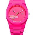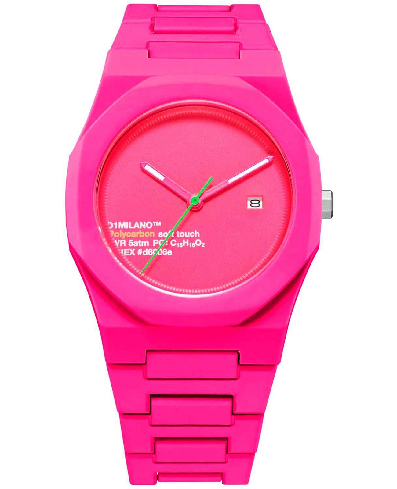 Часы D1 Milano Polycarbon PCBJ32 – молодежные часы в стиле унисекс для повседневных образов. Кварцевые часы с калибром Seiko VJ32B. Модель Hot Pink Polycarbon имеет розовый корпус из поликарбоната с покрытием Софт-Тач. Циферблат лаконичный без индексов, защищен минеральным стекломМинеральное стеклоМинеральное стекло представляет собой искусственно выращенный минерал кварца. Такое стекло отличается особой устойчивостью к повреждениям и царапинам. Уступает по некоторым качествам сапфировому стеклу. с антибликовым покрытием. Стрелки с люминесцентным покрытиемЛюминесцентное покрытиеПозволяет считывать показания времени в темноте. Производители наносят на стрелки, часовые индексы, безель или поверхность циферблата светонакопительный состав, дающий холодное свечение.. Окошко даты находится в положении 3 часов. Контрастная секундная стрелка дополняет стильный образ. Стальная задняя крышка на 4 винтах. Пластиковый браслет с раскладной застёжкойРаскладная застёжкаТакой тип застёжки используется только на браслетах из металла. Она никогда не раскрывается полностью, происходит разделение на 2 и более частей. Раскладывающая застёжка снизит вероятность потери часов к минимуму..