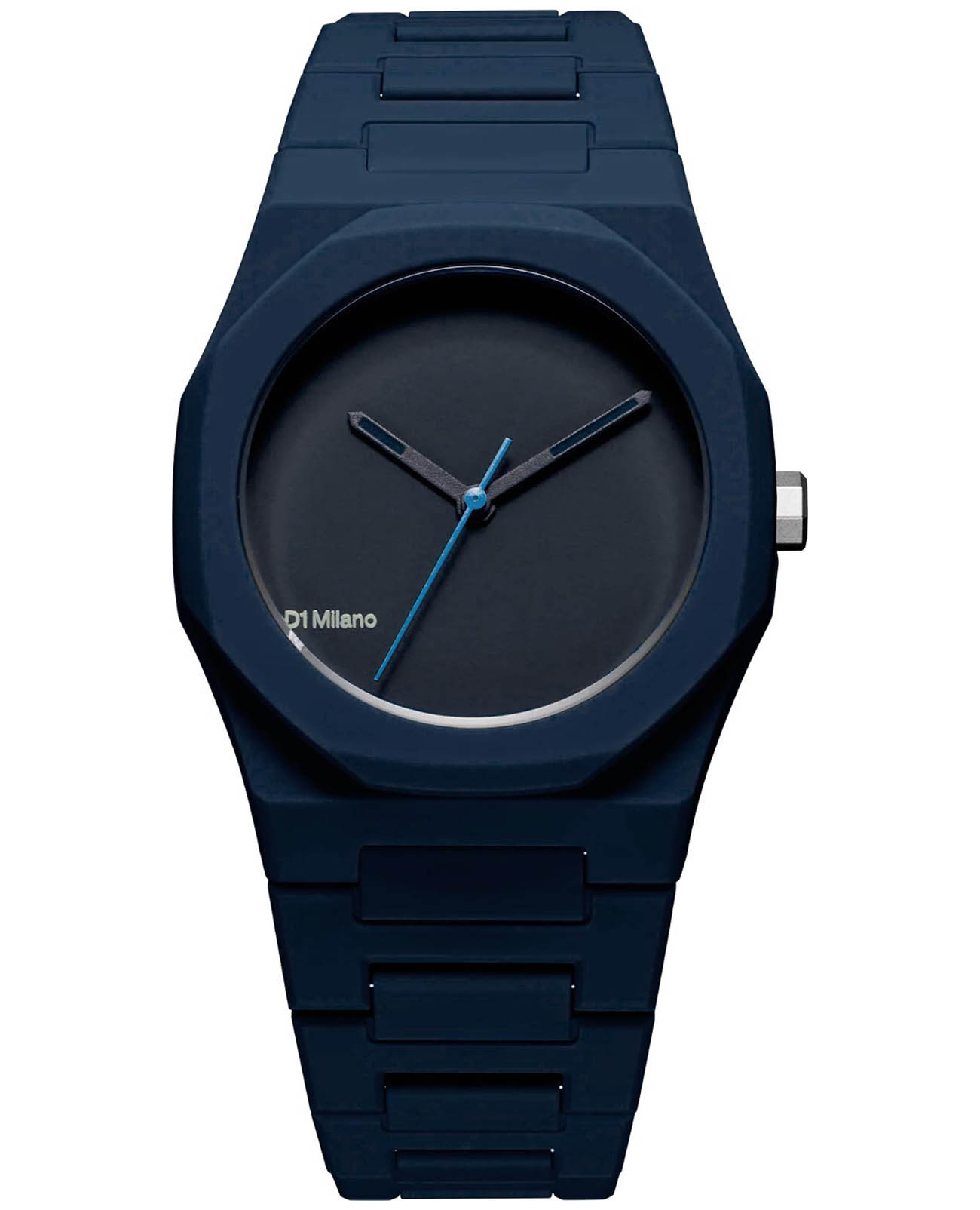 Часы D1 Milano Polycarbon PCBU09 – молодежные часы в стиле унисекс для повседневных образов, стильные и комфортные. Модель имеет темно-синий корпус и браслет из поликарбоната с покрытием Софт-Тач.. Циферблат лаконичный с индексами в виде штрихов, защищен минеральным стекломМинеральное стеклоМинеральное стекло представляет собой искусственно выращенный минерал кварца. Такое стекло отличается особой устойчивостью к повреждениям и царапинам. Уступает по некоторым качествам сапфировому стеклу. с антибликовым покрытием. Стальная задняя крышка на 4 винтах. Пластиковый браслет на застёжке-бабочке с кнопкамиЗастёжка "бабочка"Такой вид застёжки дополняется предохранителями, помогающими избежать случайного раскрытия браслета. Обладают изящным исполнением. .