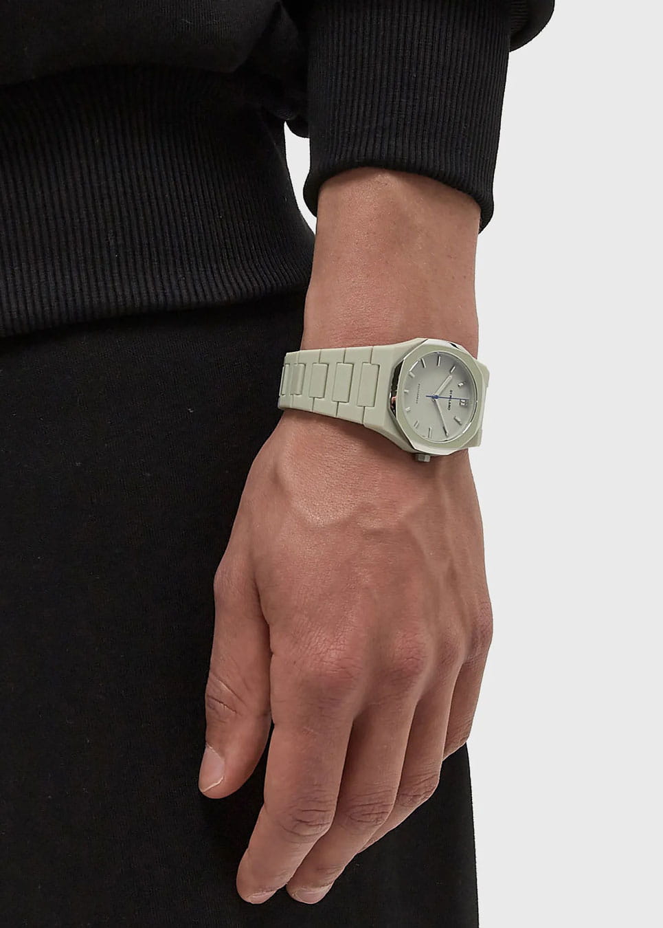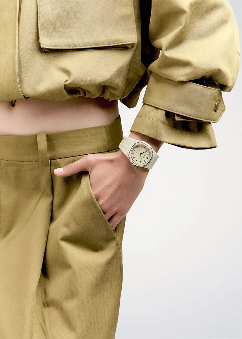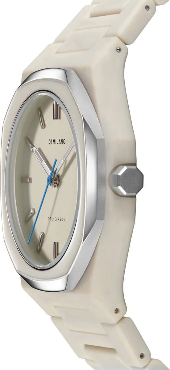 Часы D1 Milano Polycarbon Grey Mesh PCBU16 – современные часы для повседневных образов. Модель имеет серо-бежевый корпус из поликарбоната с покрытием Софт-Тач и полированный стальной безельБезельВнешний ободок, закрепляющий стекло. В спортивных часах так называется поворотное кольцо с делениями на циферблате, выполняет роль таймера – замеряет отрезки времени на шкале. Неподвижный безель – элемент декора. Однонаправленно вращающийся безель на дайверских часах позволяет фиксировать моменты погружения и выныривания на поверхность. с эмалью. Циферблат матовый и лаконичный с индексами в виде штрихов, защищен минеральным стекломМинеральное стеклоМинеральное стекло представляет собой искусственно выращенный минерал кварца. Такое стекло отличается особой устойчивостью к повреждениям и царапинам. Уступает по некоторым качествам сапфировому стеклу. с антибликовым покрытиемАнтибликовое покрытиеСлой оксида металла в 0,13-0,3 микрон, благодаря которому стекло часов не бликует и не отражает свет. Антибликовое покрытие уменьшает отражение света в 10 раз, обеспечивая отличную читаемость показателей циферблата.. Изысканные стрелки выполнены из латуни с люминесцентным покрытиемЛюминесцентное покрытиеПозволяет считывать показания времени в темноте. Производители наносят на стрелки, часовые индексы, безель или поверхность циферблата светонакопительный состав, дающий холодное свечение., гармонично дополняющим общий дизайн модели. Задняя крышка закреплена на 4 винтах, что обеспечивает надежность конструкции. Элегантный пластиковый браслет с покрытием Софт-Тач на застёжке-бабочкеЗастёжка "бабочка"Такой вид застёжки дополняется предохранителями, помогающими избежать случайного раскрытия браслета. Обладают изящным исполнением. . Водозащита 50 метров защищает часы от брызг и дождя, делая их подходящими для повседневного использования. D1 Milano – для тех, кто умеет ценить индивидуальность.