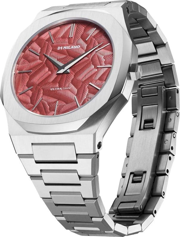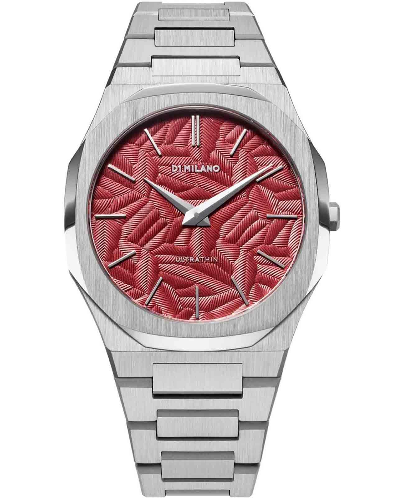 Часы D1 Milano UTBJ33 — это уникальные кварцевые часы, которые подчеркнут ваш изысканный стиль. Эти наручные часы из коллекции Ultra Thin с эффектным монохромным дизайном станут выразительным акцентом вашего образа. Корпус диаметром 40 мм из нержавеющей стали придает часам современный и утонченный вид. Циферблат красного цвета выполнен в виде фигурного узора, напоминающего листья, а серебристые хроматические стрелки и индексы создают стильный контраст, подчёркивая элегантность модели. Задняя крышка из нержавеющей стали закреплена на 8-х винтах и дополнена индивидуальным серийным номером, что подчеркивает уникальность каждого экземпляра. Стальной браслет с раскладной застёжкойРаскладная застёжкаТакой тип застёжки используется только на браслетах из металла. Она никогда не раскрывается полностью, происходит разделение на 2 и более частей. Раскладывающая застёжка снизит вероятность потери часов к минимуму. обеспечивает надежность и комфорт в повседневном использовании. Сапфировое стеклоСапфировое стеклоПрочный и надёжный материал из кристалла сапфира синтетического происхождения, характеризующийся особой твёрдостью и устойчивостью к царапинам и повреждениям. с антибликовым покрытием защищает циферблат, а водозащита до 50WR делает эти часы практичным выбором для любых условий. Благодаря калибру Miyota GL24, они отличаются точностью и надежностью. Эти итальянские часы представляют собой идеальное сочетание традиционного мастерства и инновационного подхода, воплощая в себе новый взгляд на классическую элегантность.