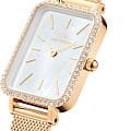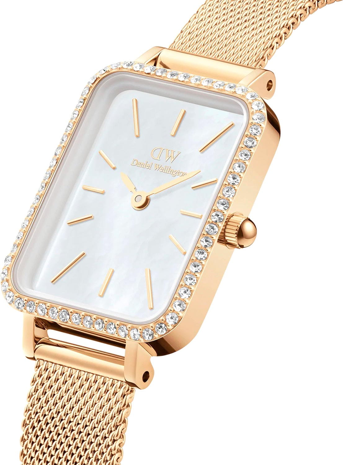 Женские наручные часы с минеральным стекломМинеральное стеклоМинеральное стекло представляет собой искусственно выращенный минерал кварца. Такое стекло отличается особой устойчивостью к повреждениям и царапинам. Уступает по некоторым качествам сапфировому стеклу. Daniel Wellington Quadro Lumine Bezel Evergold MOP DW00100668, кварцевый механизм с высокой точностью. Корпус часов изготовлен из нержавеющей стали с PVD-покрытиемPVDУльтратонкое покрытие наносится в технике вакуумного напыления, сочетает в себе нитрид титана особой прочности со слоем золота или оксида хрома. Несёт в себе декоративную или защитную функцию.. БезельБезельВнешний ободок, закрепляющий стекло. В спортивных часах так называется поворотное кольцо с делениями на циферблате, выполняет роль таймера – замеряет отрезки времени на шкале. Неподвижный безель – элемент декора. Однонаправленно вращающийся безель на дайверских часах позволяет фиксировать моменты погружения и выныривания на поверхность. украшен кристаллами Swarovski. Матовый циферблат украшен фирменным логотипом Daniel Wellington. Накладные метки в виде штрихов. Японский кварцевый механизм. Рифленая заводная головка. Класс водозащиты: 30 метров, позволит защитить корпус от случайных брызг или капель дождя. Стальной браслет миланского плетения с PVD-покрытиемPVDУльтратонкое покрытие наносится в технике вакуумного напыления, сочетает в себе нитрид титана особой прочности со слоем золота или оксида хрома. Несёт в себе декоративную или защитную функцию. на раскладном замкеРаскладной замокДанный вариант застежки используется только на часах с металлическим браслетом. Отличительная особенность такого крепления в том, что длина браслета становится универсальной и вы можете самостоятельно отрегулировать нужный вам размер – застежка просто двигается по браслету часов..