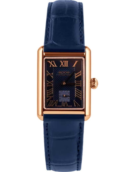 Epos 8002.702.24.26.16 — женская модель с утончённым классическим стилем и прямоугольным корпусом, выполненным из нержавеющей стали с PVD-покрытиемPVDУльтратонкое покрытие наносится в технике вакуумного напыления, сочетает в себе нитрид титана особой прочности со слоем золота или оксида хрома. Несёт в себе декоративную или защитную функцию.. Черный циферблат оформлен римскими индексами и утончённым узором «Clous de Paris», создающим игру света и подчёркивающим глубину дизайна. Защитную функцию выполняет сапфировое стеклоСапфировое стеклоПрочный и надёжный материал из кристалла сапфира синтетического происхождения, характеризующийся особой твёрдостью и устойчивостью к царапинам и повреждениям., стойкое к царапинам и сохраняющее прозрачность. В основе лежит швейцарский автоматический механизм, обеспечивающий стабильность и точность хода. Функции включают индикацию часов, минут и малую секундную шкалу, расположенную в позиции «6 часов». Часы дополнены кожаным ремешком, который гармонично завершает строгий образ модели.