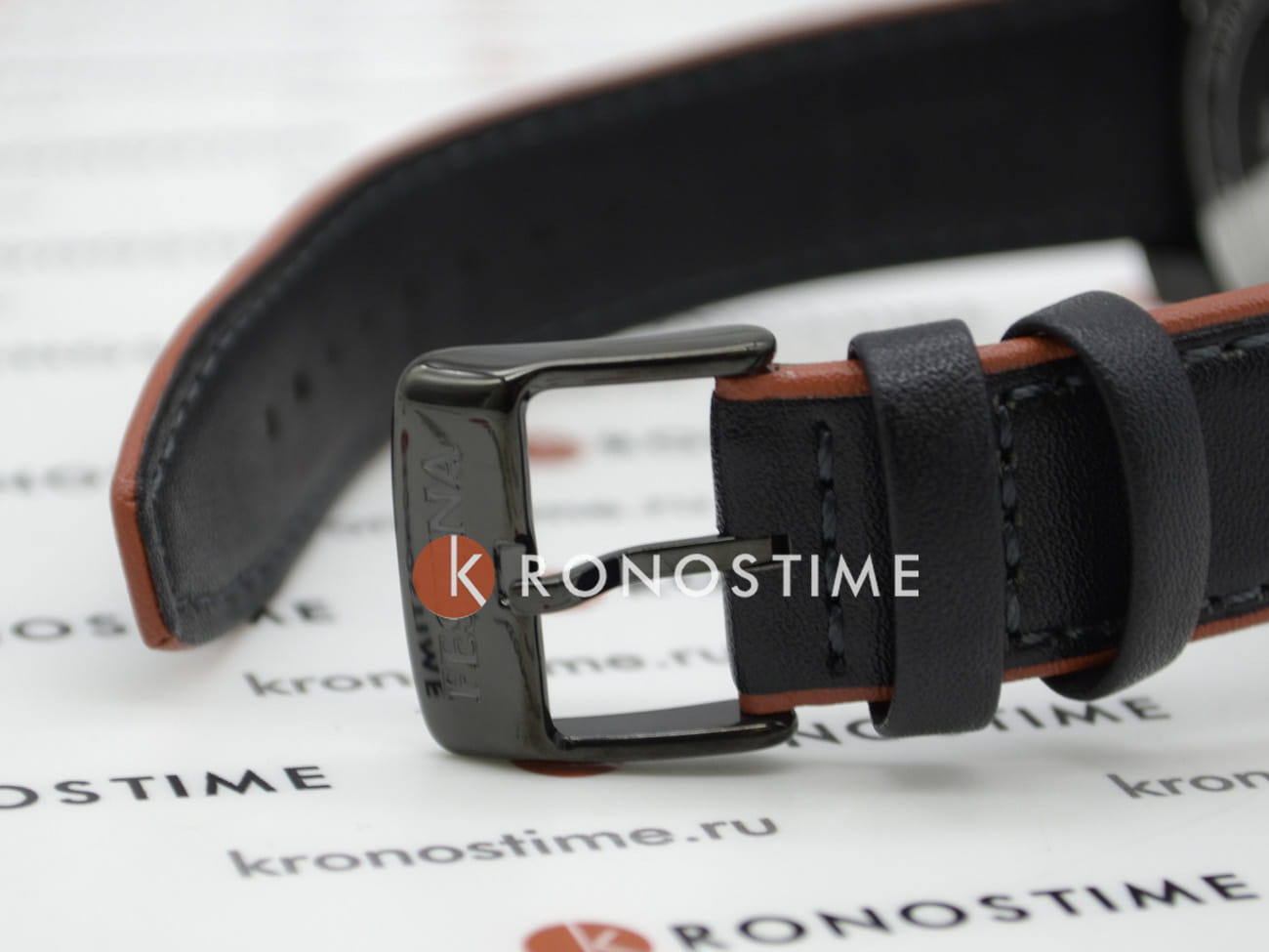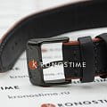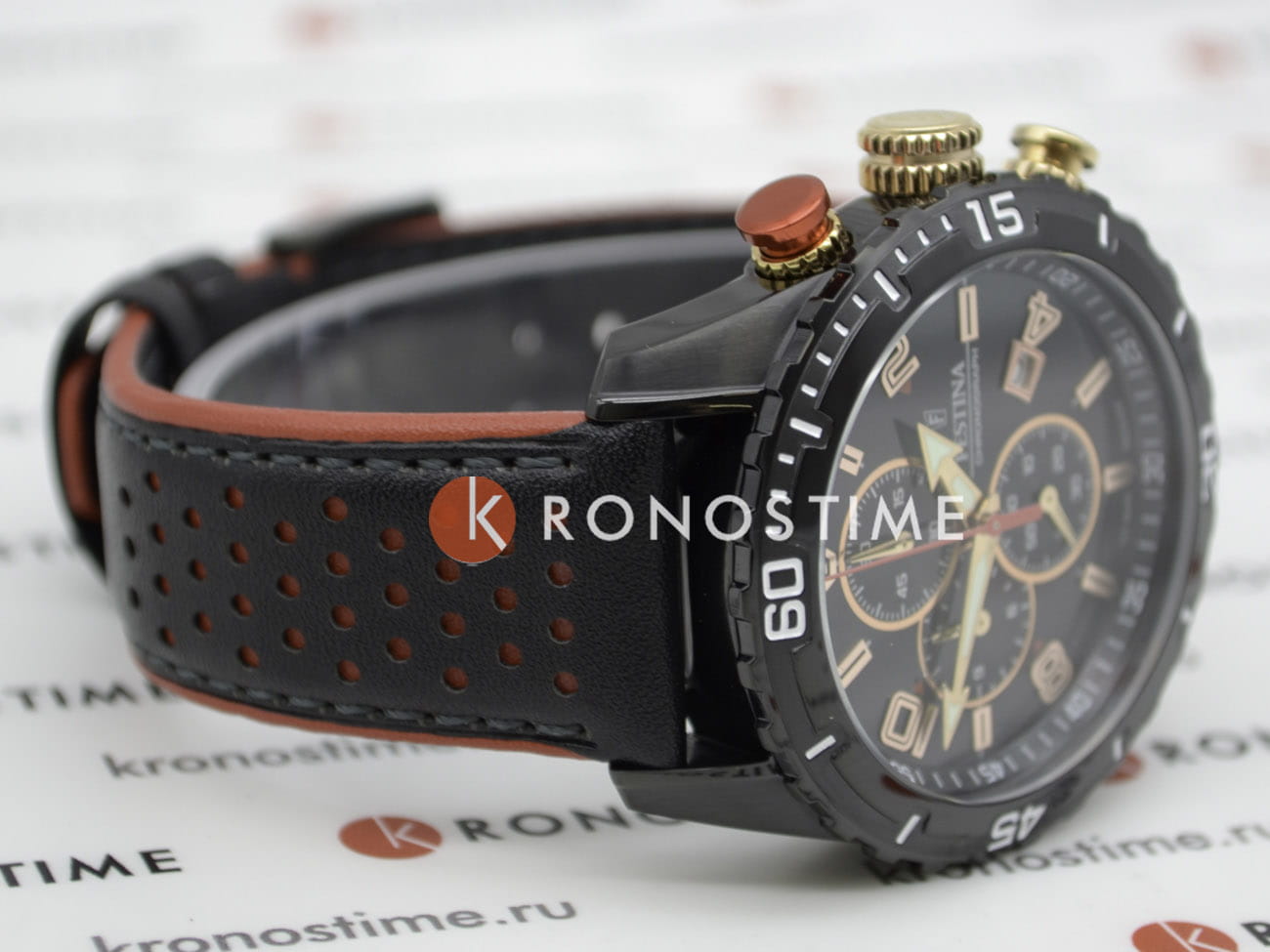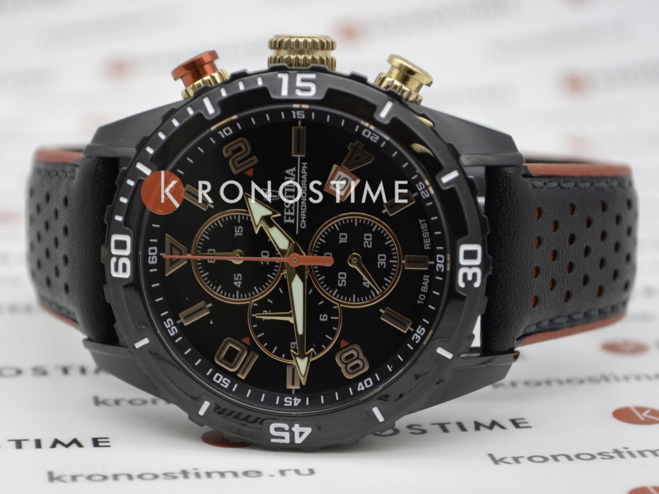 Часы-хронографХронографФункция позволяет измерять отрезки времени с особой точностью: часы, минуты, секунды. Верным признаком хронографа является наличие на циферблате 3 дополнительных окошек-счётчиков.. Кварцевый механизм с высокой точностью. Минеральное стеклоМинеральное стеклоМинеральное стекло представляет собой искусственно выращенный минерал кварца. Такое стекло отличается особой устойчивостью к повреждениям и царапинам. Уступает по некоторым качествам сапфировому стеклу. устойчивое к появлению царапин, обладающее высокой прозрачностью.  Класс водозащиты: 100 метров, позволит плавать, нырять и заниматься другими водными видами спорта. Стрелки и метки с люминесцентным покрытиемЛюминесцентное покрытиеПозволяет считывать показания времени в темноте. Производители наносят на стрелки, часовые индексы, безель или поверхность циферблата светонакопительный состав, дающий холодное свечение.. Корпус часов изготовлен из нержавеющей стали c PVD-покрытиемPVDУльтратонкое покрытие наносится в технике вакуумного напыления, сочетает в себе нитрид титана особой прочности со слоем золота или оксида хрома. Несёт в себе декоративную или защитную функцию.. Кожаный ремешок с классической застежкой.