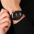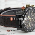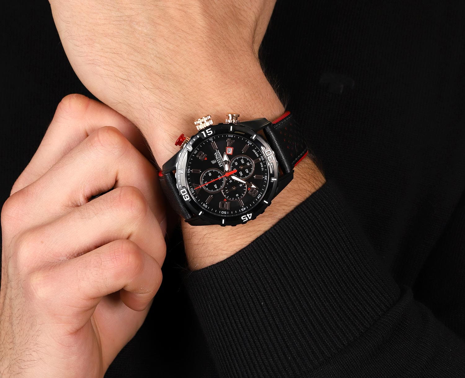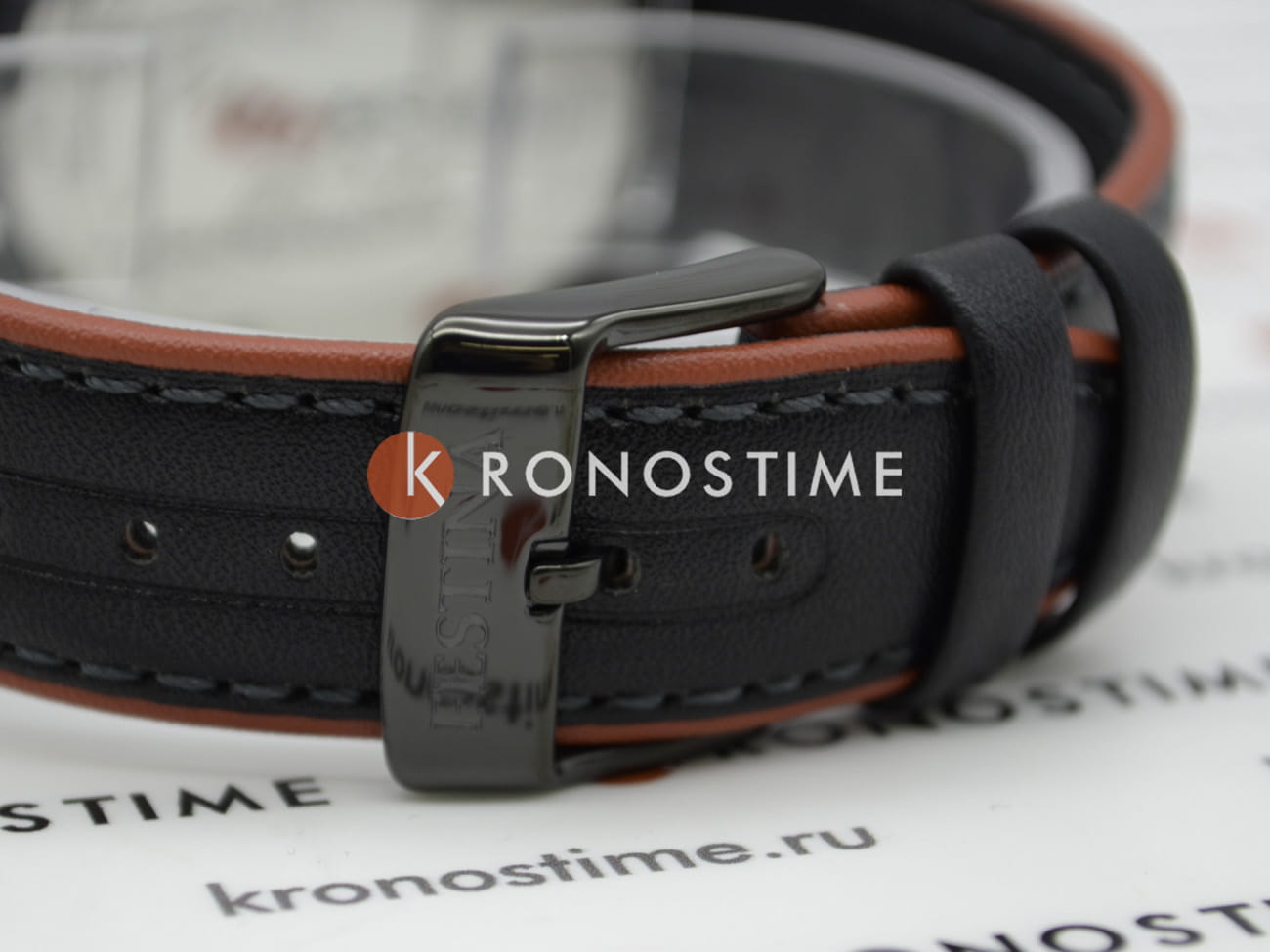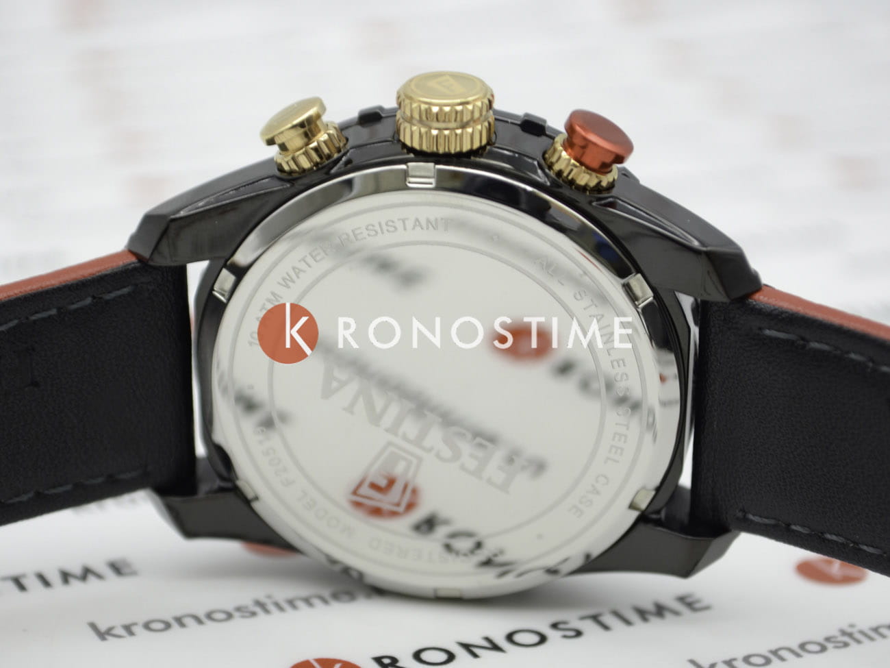 Часы-хронографХронографФункция позволяет измерять отрезки времени с особой точностью: часы, минуты, секунды. Верным признаком хронографа является наличие на циферблате 3 дополнительных окошек-счётчиков.. Кварцевый механизм с высокой точностью. Минеральное стеклоМинеральное стеклоМинеральное стекло представляет собой искусственно выращенный минерал кварца. Такое стекло отличается особой устойчивостью к повреждениям и царапинам. Уступает по некоторым качествам сапфировому стеклу. устойчивое к появлению царапин, обладающее высокой прозрачностью.  Класс водозащиты: 100 метров, позволит плавать, нырять и заниматься другими водными видами спорта. Стрелки и метки с люминесцентным покрытиемЛюминесцентное покрытиеПозволяет считывать показания времени в темноте. Производители наносят на стрелки, часовые индексы, безель или поверхность циферблата светонакопительный состав, дающий холодное свечение.. Корпус часов изготовлен из нержавеющей стали c PVD-покрытиемPVDУльтратонкое покрытие наносится в технике вакуумного напыления, сочетает в себе нитрид титана особой прочности со слоем золота или оксида хрома. Несёт в себе декоративную или защитную функцию.. Кожаный ремешок с классической застежкой.
