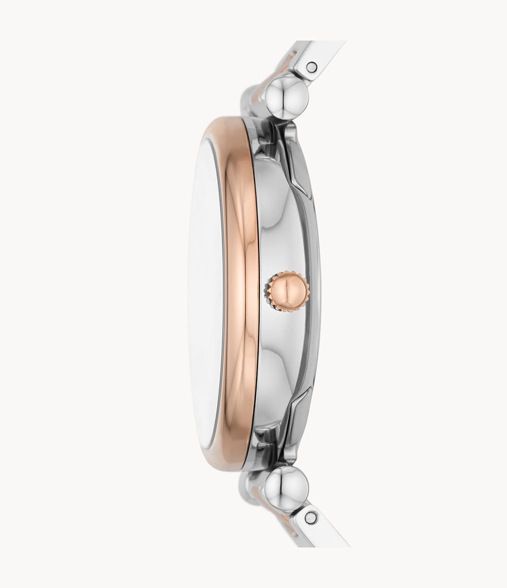Женские американские часы Fossil Carlie ES5156, кварцевый механизм с высокой точностью. Класс водозащиты: 50 метров, позволит защитить корпус от случайных брызг или капель дождя. Круглый стальной корпус c полированной поверхностью изготовлен из стали с частичным розовым IP-покрытиемIP-покрытиеМетод ионного напыления. Демонстрирует повышенную устойчивость к истиранию, окислению и химическим веществам. Под воздействием высокого давления и температуры около 1500°C молекулы металла надёжно соединяются с частицами корпуса часов.. Центральная часть циферблата украшена декоративным узором. Метки в виде арабских цифр и штрихов с люминесцентной подсветкойЛюминесцентное покрытиеПозволяет считывать показания времени в темноте. Производители наносят на стрелки, часовые индексы, безель или поверхность циферблата светонакопительный состав, дающий холодное свечение.. Окошко даты находится между часовыми отметками 4 и 5. Рифленая заводная головка. Полированный стальной браслет с частичным розовым IP-покрытиемIP-покрытиеМетод ионного напыления. Демонстрирует повышенную устойчивость к истиранию, окислению и химическим веществам. Под воздействием высокого давления и температуры около 1500°C молекулы металла надёжно соединяются с частицами корпуса часов. имеет раскладывающуюся застежкуРаскладная застёжкаТакой тип застёжки используется только на браслетах из металла. Она никогда не раскрывается полностью, происходит разделение на 2 и более частей. Раскладывающая застёжка снизит вероятность потери часов к минимуму..