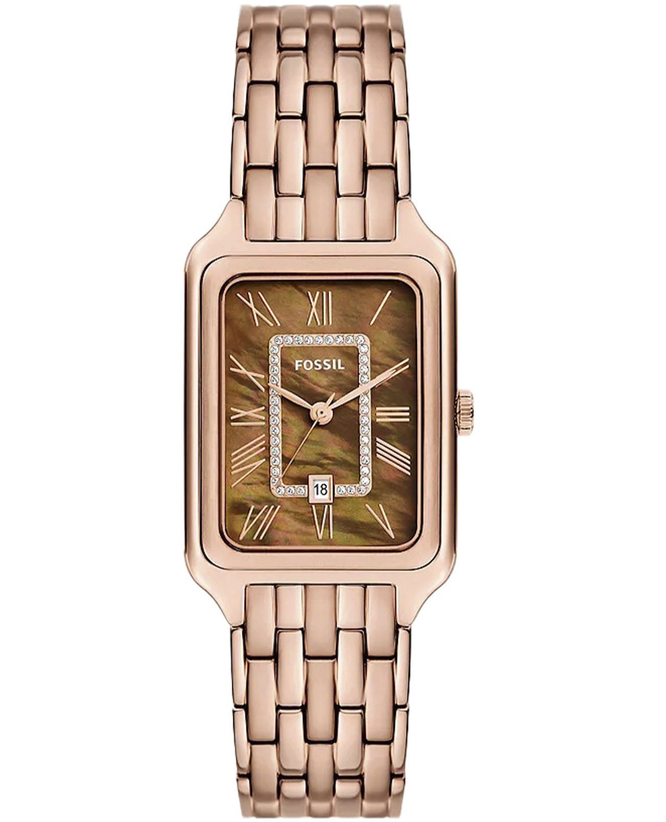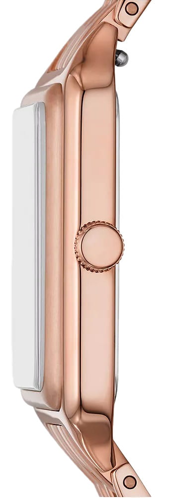 Женские американские часы с минеральным стекломМинеральное стеклоМинеральное стекло представляет собой искусственно выращенный минерал кварца. Такое стекло отличается особой устойчивостью к повреждениям и царапинам. Уступает по некоторым качествам сапфировому стеклу. Fossil Raquel ES5323, кварцевый механизм с высокой точностью. Корпус и браслет часов изготовлены из нержавеющей стали с IP-покрытиемIP-покрытиеМетод ионного напыления. Демонстрирует повышенную устойчивость к истиранию, окислению и химическим веществам. Под воздействием высокого давления и температуры около 1500°C молекулы металла надёжно соединяются с частицами корпуса часов.. Класс водозащиты: 50 метров, позволит защитить корпус от случайных брызг или капель дождя. Стальной браслет на раскладной застёжкеРаскладная застёжкаТакой тип застёжки используется только на браслетах из металла. Она никогда не раскрывается полностью, происходит разделение на 2 и более частей. Раскладывающая застёжка снизит вероятность потери часов к минимуму.. Окошко даты находится в положении 6 часов. Циферблат украшен кристаллами.