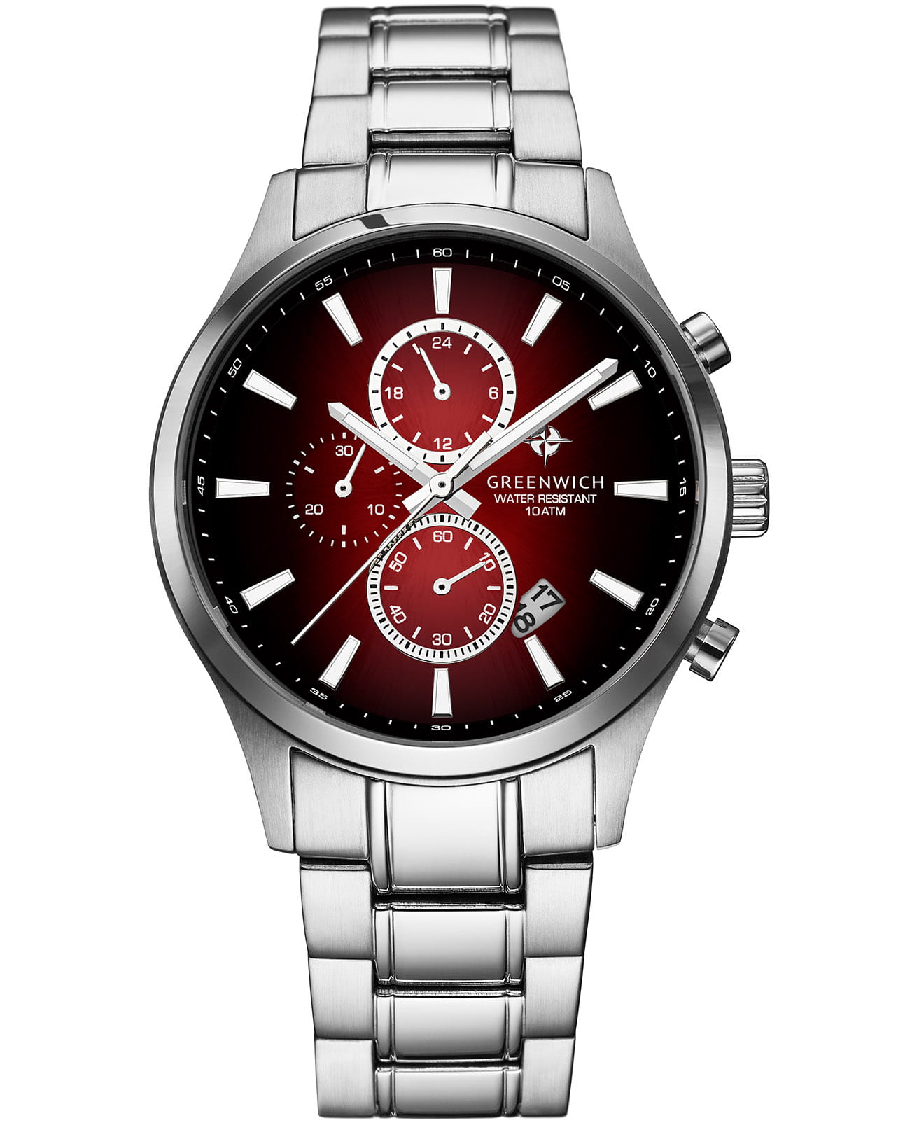 Мужские наручные часы-хронографХронографФункция позволяет измерять отрезки времени с особой точностью: часы, минуты, секунды. Верным признаком хронографа является наличие на циферблате 3 дополнительных окошек-счётчиков. Greenwich Navigator GW 053.10.35 представляют собой классический вариант для повседневной носки. Циферблат украшается брендовым логотипом, изображающим Розу Ветров. Эмблема мореплавательского духа символизирует удачу, стремление достигнуть поставленной цели. Часы характеризуются традиционными формами, лаконичным исполнением, что делает модель элегантным дополнением к деловому костюму. Надёжный корпус из нержавеющей стали спасает японский механизм от повреждений и ударов. Минеральное стеклоМинеральное стеклоМинеральное стекло представляет собой искусственно выращенный минерал кварца. Такое стекло отличается особой устойчивостью к повреждениям и царапинам. Уступает по некоторым качествам сапфировому стеклу. отличается устойчивостью к образованию царапин на поверхности. СекундомерСекундомерСекундоме́р — прибор, способный измерять интервалы времени с точностью до долей секунды.. Стрелки и метки с люминесцентным покрытиемЛюминесцентное покрытиеПозволяет считывать показания времени в темноте. Производители наносят на стрелки, часовые индексы, безель или поверхность циферблата светонакопительный состав, дающий холодное свечение.. Стальной браслет на раскладной застёжкеРаскладная застёжкаТакой тип застёжки используется только на браслетах из металла. Она никогда не раскрывается полностью, происходит разделение на 2 и более частей. Раскладывающая застёжка снизит вероятность потери часов к минимуму.. Окошко даты находится в положении между 4 и 5 часов. Класс водозащиты: 100 метров, позволит плавать, нырять и заниматься другими водными видами спорта.