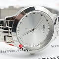 Серебристый компактный циферблат не имеет ни одной лишней детали, присутствуют лишь стрелки и оригинальная часовая разметка. Необычным оформлением отличается и браслет, для изготовления которого была использована нержавеющая сталь 316L. Кварцевый механизм работает от батарейки, имеющей продолжительный срок службы. Минеральное стекло устойчиво к образованию царапин. Водозащита до 3 бар. Диаметр корпуса: 30 мм.