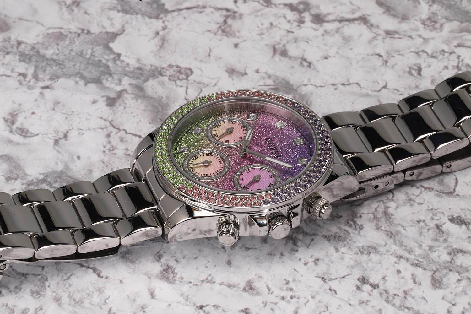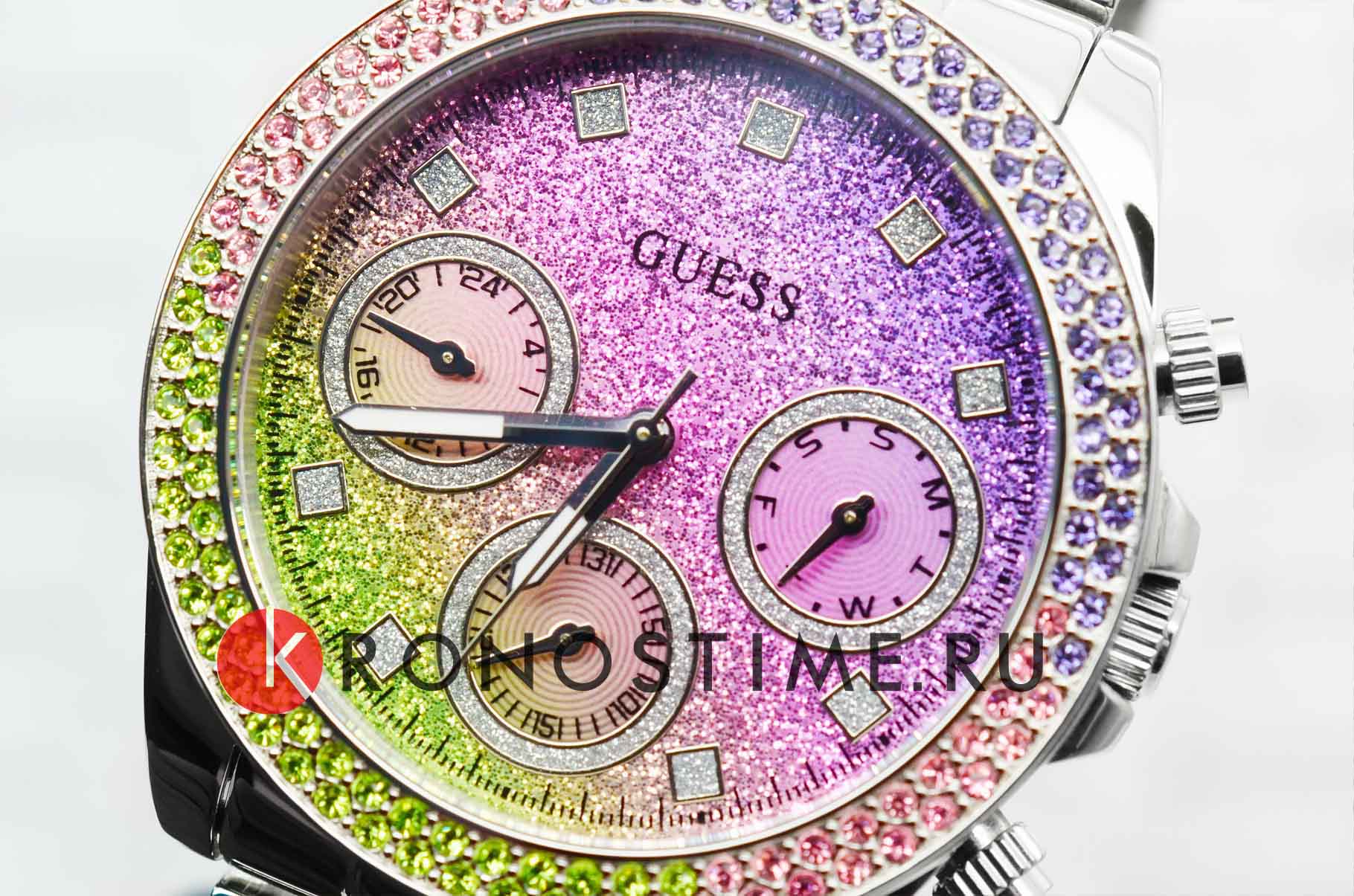 Безукоризненный функциональный аксессуар, сотканный из стали и разноцветных кристаллов, покорит ваше сердце с первого взгляда. Блистательные женские часы Sol. Круглый стальной корпус украшенный кристаллами. Глиттерный циферблат с метками в виде точек из кристаллов, защинен минеральным стекломМинеральное стеклоМинеральное стекло представляет собой искусственно выращенный минерал кварца. Такое стекло отличается особой устойчивостью к повреждениям и царапинам. Уступает по некоторым качествам сапфировому стеклу.. 12-ти и 24-х часовой формат времени. Дата и день недели вынесены на отдельные циферблаты. Рифленая заводная головка с защитой. Стальной браслет с раскладной застёжкойРаскладная застёжкаТакой тип застёжки используется только на браслетах из металла. Она никогда не раскрывается полностью, происходит разделение на 2 и более частей. Раскладывающая застёжка снизит вероятность потери часов к минимуму.