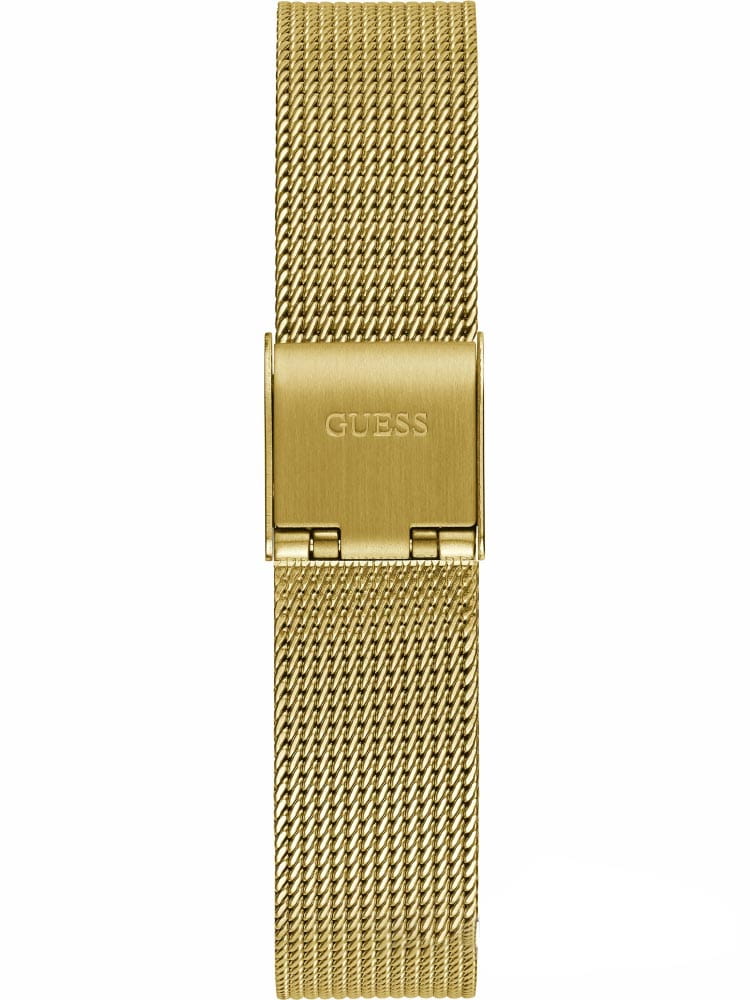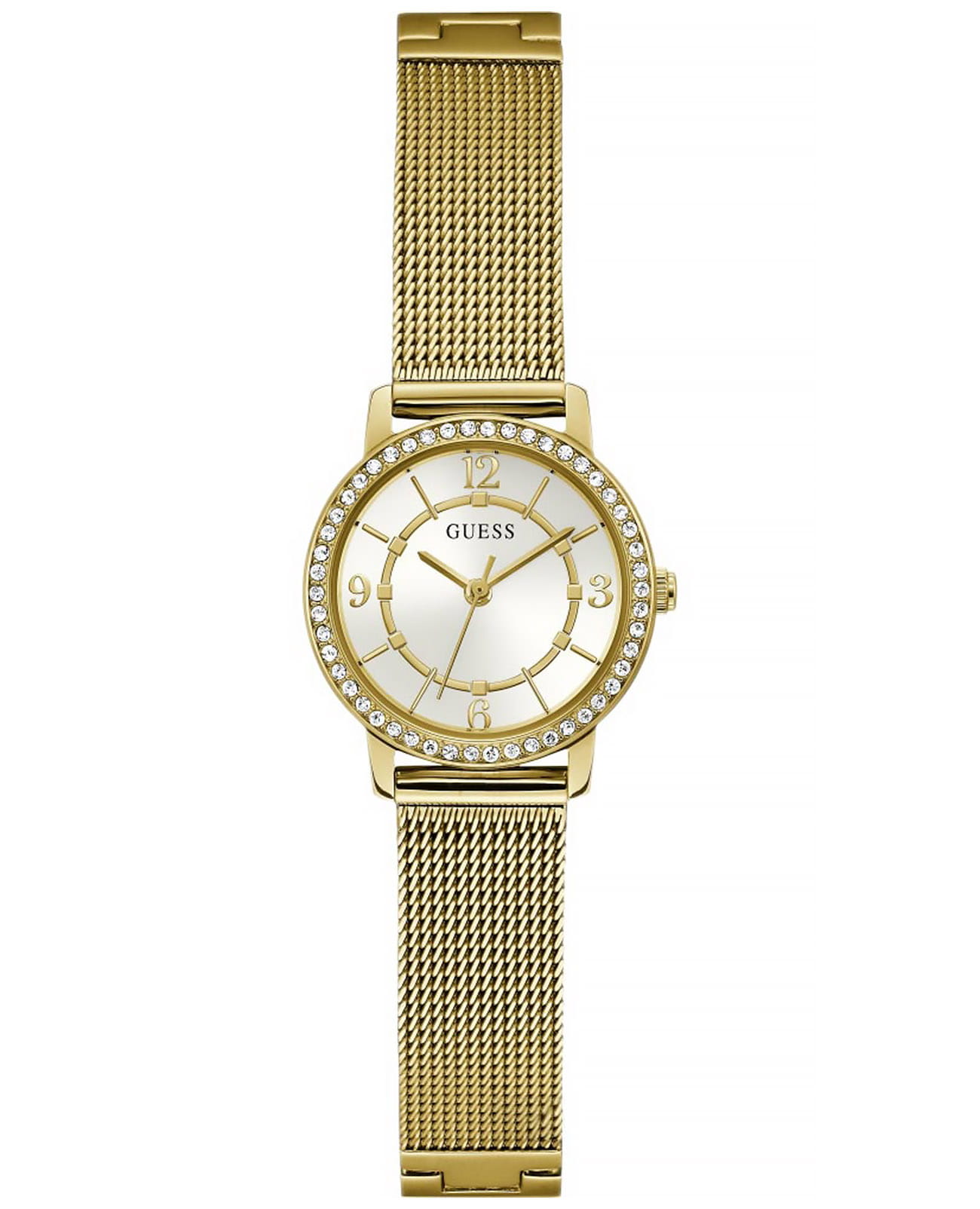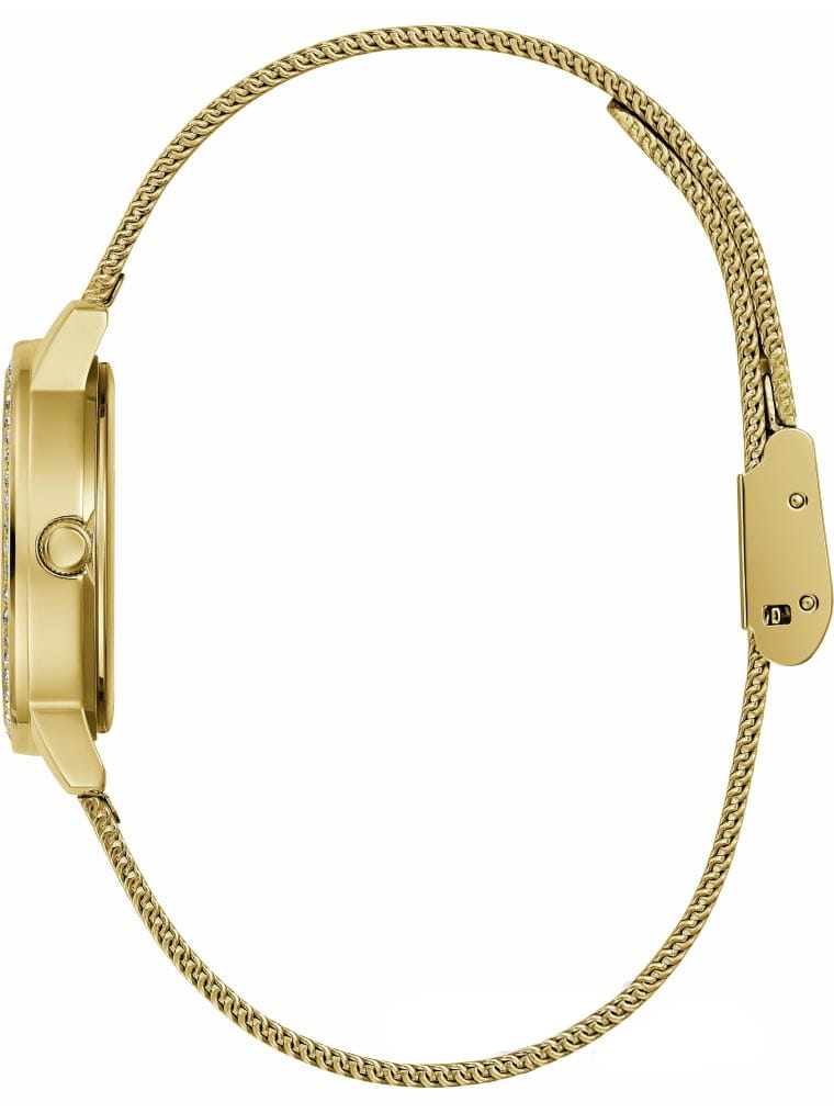 Женские наручные часы Guess Melody GW0534L2 с минеральным стекломМинеральное стеклоМинеральное стекло представляет собой искусственно выращенный минерал кварца. Такое стекло отличается особой устойчивостью к повреждениям и царапинам. Уступает по некоторым качествам сапфировому стеклу., кварцевый механизм с высокой точностью. Класс водозащиты: 30 метров, позволит защитить корпус от случайных брызг или капель дождя. Корпус часов изготовлен из стали с IP-покрытиемIP-покрытиеМетод ионного напыления. Демонстрирует повышенную устойчивость к истиранию, окислению и химическим веществам. Под воздействием высокого давления и температуры около 1500°C молекулы металла надёжно соединяются с частицами корпуса часов.. Стальной браслет на раскладной застёжкеРаскладная застёжкаТакой тип застёжки используется только на браслетах из металла. Она никогда не раскрывается полностью, происходит разделение на 2 и более частей. Раскладывающая застёжка снизит вероятность потери часов к минимуму. с IP-покрытиемIP-покрытиеМетод ионного напыления. Демонстрирует повышенную устойчивость к истиранию, окислению и химическим веществам. Под воздействием высокого давления и температуры около 1500°C молекулы металла надёжно соединяются с частицами корпуса часов.. Корпус и циферблат украшены кристаллами.