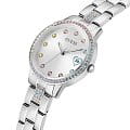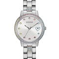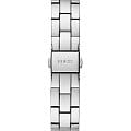 Женские наручные часы Guess Dress GW0657L1 с минеральным стекломМинеральное стеклоМинеральное стекло представляет собой искусственно выращенный минерал кварца. Такое стекло отличается особой устойчивостью к повреждениям и царапинам. Уступает по некоторым качествам сапфировому стеклу., кварцевый механизм с высокой точностью. Корпус часов изготовлен из нержавеющей стали. Стрелки с люминесцентным покрытиемЛюминесцентное покрытиеПозволяет считывать показания времени в темноте. Производители наносят на стрелки, часовые индексы, безель или поверхность циферблата светонакопительный состав, дающий холодное свечение.. Класс водозащиты: 30 метров, позволит защитить корпус от случайных брызг или капель дождя. Стальной браслет на раскладной застёжкеРаскладная застёжкаТакой тип застёжки используется только на браслетах из металла. Она никогда не раскрывается полностью, происходит разделение на 2 и более частей. Раскладывающая застёжка снизит вероятность потери часов к минимуму.. Неподвижный безельБезельВнешний ободок, закрепляющий стекло. В спортивных часах так называется поворотное кольцо с делениями на циферблате, выполняет роль таймера – замеряет отрезки времени на шкале. Неподвижный безель – элемент декора. Однонаправленно вращающийся безель на дайверских часах позволяет фиксировать моменты погружения и выныривания на поверхность. украшен кристаллами.