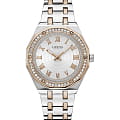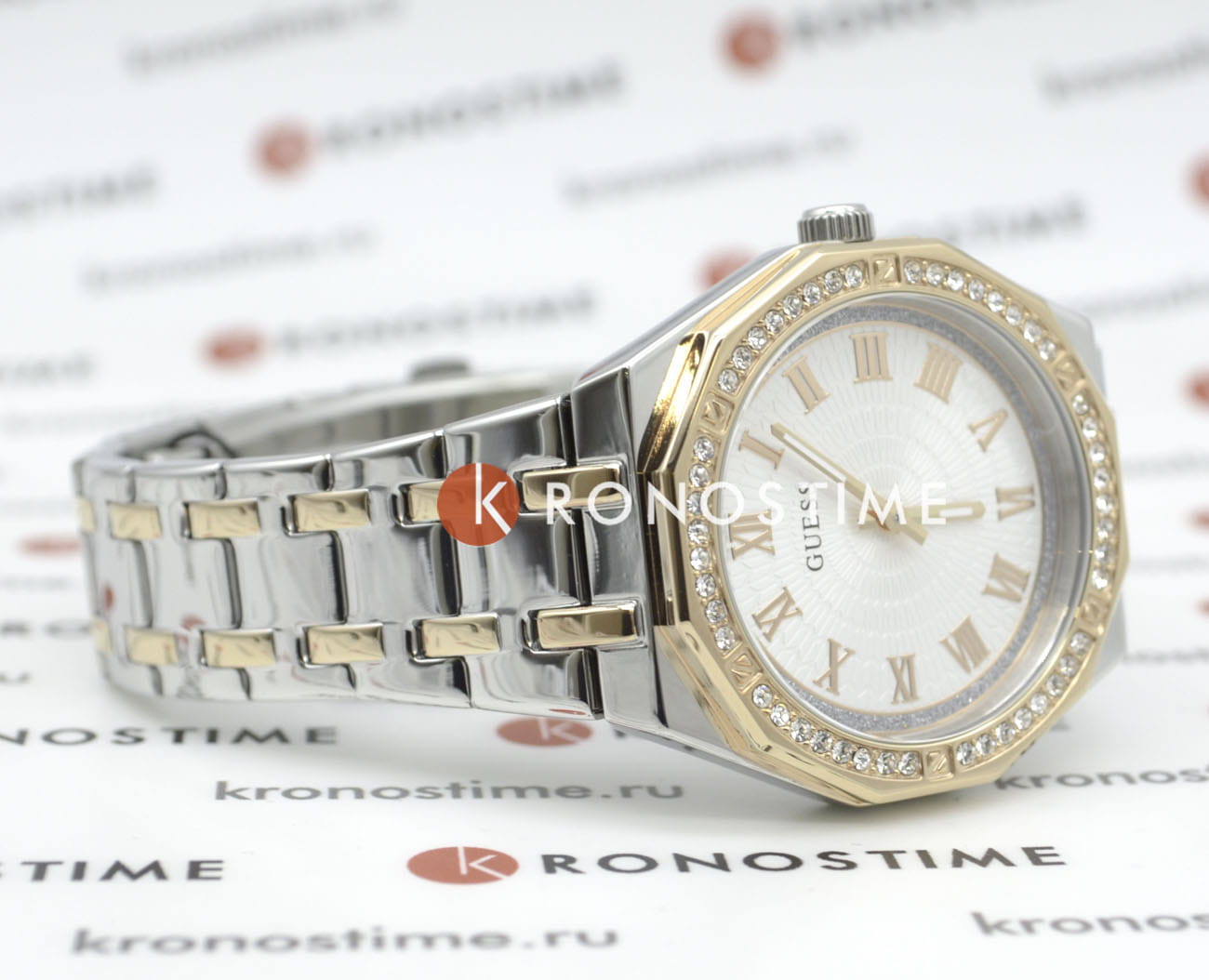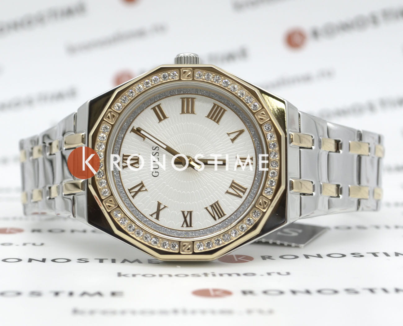 Женские наручные часы Guess Dress GW0770L5 с минеральным стекломМинеральное стеклоМинеральное стекло представляет собой искусственно выращенный минерал кварца. Такое стекло отличается особой устойчивостью к повреждениям и царапинам. Уступает по некоторым качествам сапфировому стеклу., кварцевый механизм с высокой точностью. Корпус часов изготовлен из стали. БезельБезельВнешний ободок, закрепляющий стекло. В спортивных часах так называется поворотное кольцо с делениями на циферблате, выполняет роль таймера – замеряет отрезки времени на шкале. Неподвижный безель – элемент декора. Однонаправленно вращающийся безель на дайверских часах позволяет фиксировать моменты погружения и выныривания на поверхность. с IP-покрытиемIP-покрытиеМетод ионного напыления. Демонстрирует повышенную устойчивость к истиранию, окислению и химическим веществам. Под воздействием высокого давления и температуры около 1500°C молекулы металла надёжно соединяются с частицами корпуса часов. украшен кристаллами. Стрелки с люминесцентным покрытиемЛюминесцентное покрытиеПозволяет считывать показания времени в темноте. Производители наносят на стрелки, часовые индексы, безель или поверхность циферблата светонакопительный состав, дающий холодное свечение.. Класс водозащиты: 50 метров, позволит защитить корпус от случайных брызг или капель дождя. Стальной браслет с частичным IP-покрытиемIP-покрытиеМетод ионного напыления. Демонстрирует повышенную устойчивость к истиранию, окислению и химическим веществам. Под воздействием высокого давления и температуры около 1500°C молекулы металла надёжно соединяются с частицами корпуса часов. на раскладной застёжкеРаскладная застёжкаТакой тип застёжки используется только на браслетах из металла. Она никогда не раскрывается полностью, происходит разделение на 2 и более частей. Раскладывающая застёжка снизит вероятность потери часов к минимуму..