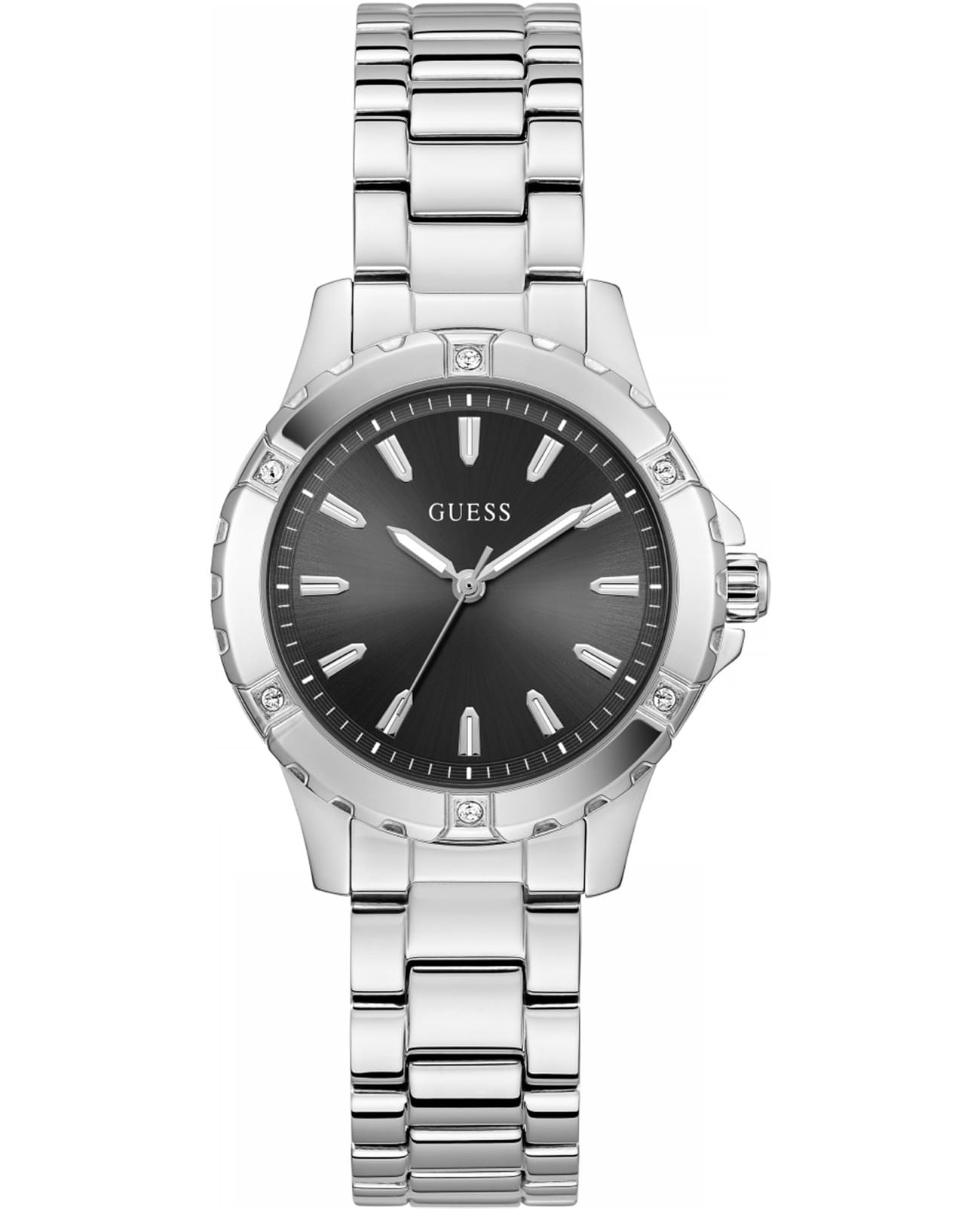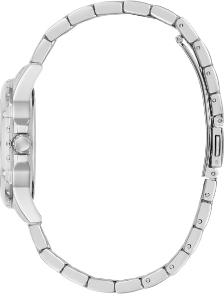 Элегантные женские наручные часы Guess Sport Mist GW0948L1 сочетают в себе стиль и функциональность. Эти часы оснащены точным кварцевым механизмом, что гарантирует надежность и долговечность. Корпус часов выполнен из прочной нержавеющей стали диаметром 35 мм. БезельБезельВнешний ободок, закрепляющий стекло. В спортивных часах так называется поворотное кольцо с делениями на циферблате, выполняет роль таймера – замеряет отрезки времени на шкале. Неподвижный безель – элемент декора. Однонаправленно вращающийся безель на дайверских часах позволяет фиксировать моменты погружения и выныривания на поверхность. украшен изысканными кристаллами, придающими им роскошный вид. Черный циферблат добавляет изделию утонченности и особого шарма. Часы оснащены стальным браслетом с раскладной застежкойРаскладная застёжкаТакой тип застёжки используется только на браслетах из металла. Она никогда не раскрывается полностью, происходит разделение на 2 и более частей. Раскладывающая застёжка снизит вероятность потери часов к минимуму., который обеспечивает комфортное прилегание к запястью и надежную фиксацию. Люминесцентное покрытиеЛюминесцентное покрытиеПозволяет считывать показания времени в темноте. Производители наносят на стрелки, часовые индексы, безель или поверхность циферблата светонакопительный состав, дающий холодное свечение. на стрелках обеспечивает отличную видимость в темноте. Минеральное стеклоМинеральное стеклоМинеральное стекло представляет собой искусственно выращенный минерал кварца. Такое стекло отличается особой устойчивостью к повреждениям и царапинам. Уступает по некоторым качествам сапфировому стеклу. защищает циферблат от царапин и повреждений, сохраняя его безупречный вид. Водозащита 50WR гарантирует защиту от случайных брызг и дождя, что делает эти часы практичным аксессуаром для повседневной жизни.
