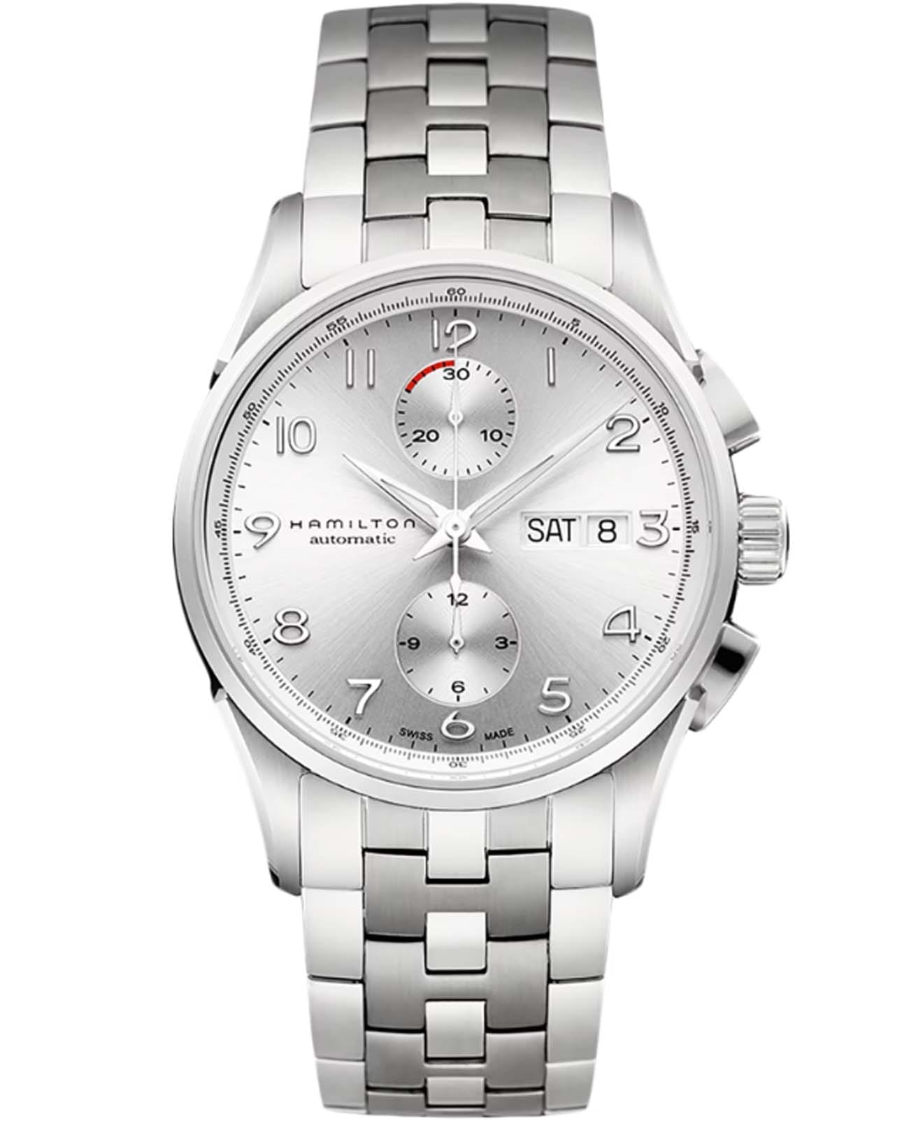 Мужские наручные часы-хронографХронографФункция позволяет измерять отрезки времени с особой точностью: часы, минуты, секунды. Верным признаком хронографа является наличие на циферблате 3 дополнительных окошек-счётчиков. Hamilton Jazzmaster Maestro Auto Chrono H32576155 с автоматическим механизмом. Корпус выполнен из нержавеющей стали. Сапфировое стеклоСапфировое стеклоПрочный и надёжный материал из кристалла сапфира синтетического происхождения, характеризующийся особой твёрдостью и устойчивостью к царапинам и повреждениям. устойчивое к мелким механическим повреждениям. Стальной браслет на застёжке-бабочке с кнопкамиЗастёжка "бабочка"Такой вид застёжки дополняется предохранителями, помогающими избежать случайного раскрытия браслета. Обладают изящным исполнением. . Стрелки и метки с люминесцентным покрытиемЛюминесцентное покрытиеПозволяет считывать показания времени в темноте. Производители наносят на стрелки, часовые индексы, безель или поверхность циферблата светонакопительный состав, дающий холодное свечение.. Окошки дня недели и даты находятся в положении 3 часа. Класс водозащиты: 100 метров, позволит плавать, нырять и заниматься другими водными видами спорта.