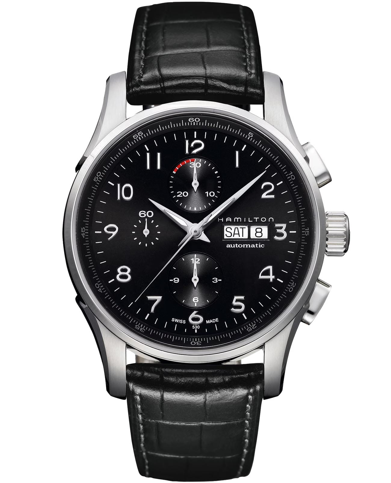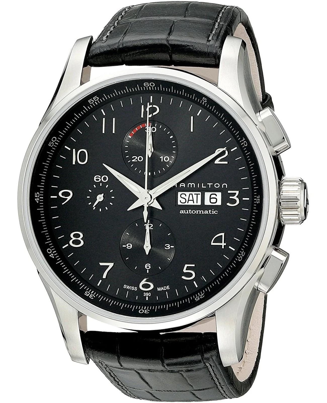 Мужские наручные часы-хронографХронографФункция позволяет измерять отрезки времени с особой точностью: часы, минуты, секунды. Верным признаком хронографа является наличие на циферблате 3 дополнительных окошек-счётчиков. Hamilton Jazzmaster Maestro Auto Chrono H32716839 с автоматическим механизмом. Корпус выполнен из нержавеющей стали. Сапфировое стеклоСапфировое стеклоПрочный и надёжный материал из кристалла сапфира синтетического происхождения, характеризующийся особой твёрдостью и устойчивостью к царапинам и повреждениям. устойчивое к мелким механическим повреждениям. Кожаный ремешок на стандартной застёжке. Стрелки и метки с люминесцентным покрытиемЛюминесцентное покрытиеПозволяет считывать показания времени в темноте. Производители наносят на стрелки, часовые индексы, безель или поверхность циферблата светонакопительный состав, дающий холодное свечение.. Окошки дня недели и даты находятся в положении 3 часа. Класс водозащиты: 100 метров, позволит плавать, нырять и заниматься другими водными видами спорта.